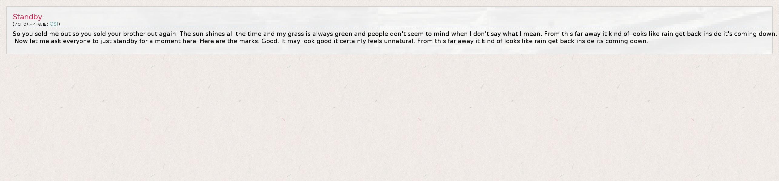 So you sold me out so you sold your brother out again. The sun shines all the time and my grass is always green and people don't seem to mind when I don't say what I mean. From this far away it kind of looks like rain get back inside it's coming down.