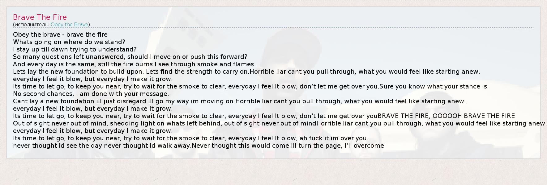 Its time to let go, to keep you near, try to wait for the smoke to clear, everyday I feel It blow, don't let me get over youBRAVE THE FIRE, OOOOOH BRAVE THE FIRE
