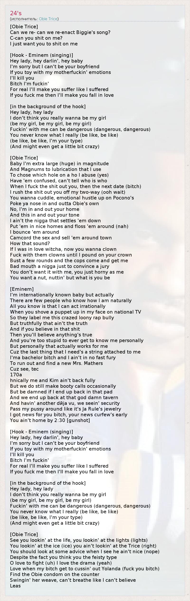Это интересно:Возможно вы не поверите, но Оби Трайс – это настоящее имя Оби Трайса (об этом и речь идет в сэмпле). Понимаем, что это негоже нормальному рэпперу, но такое звучное имя менять на что-либо глупо. Всю свою жизнь Оби прожил в Детройте, чему, скажем прямо, и обязан своим нынешним положением.Свое приобщение к хип-хопу Трайс начал с банального караоке, подаренного мамой, когда мальчику исполнилось... продолжение