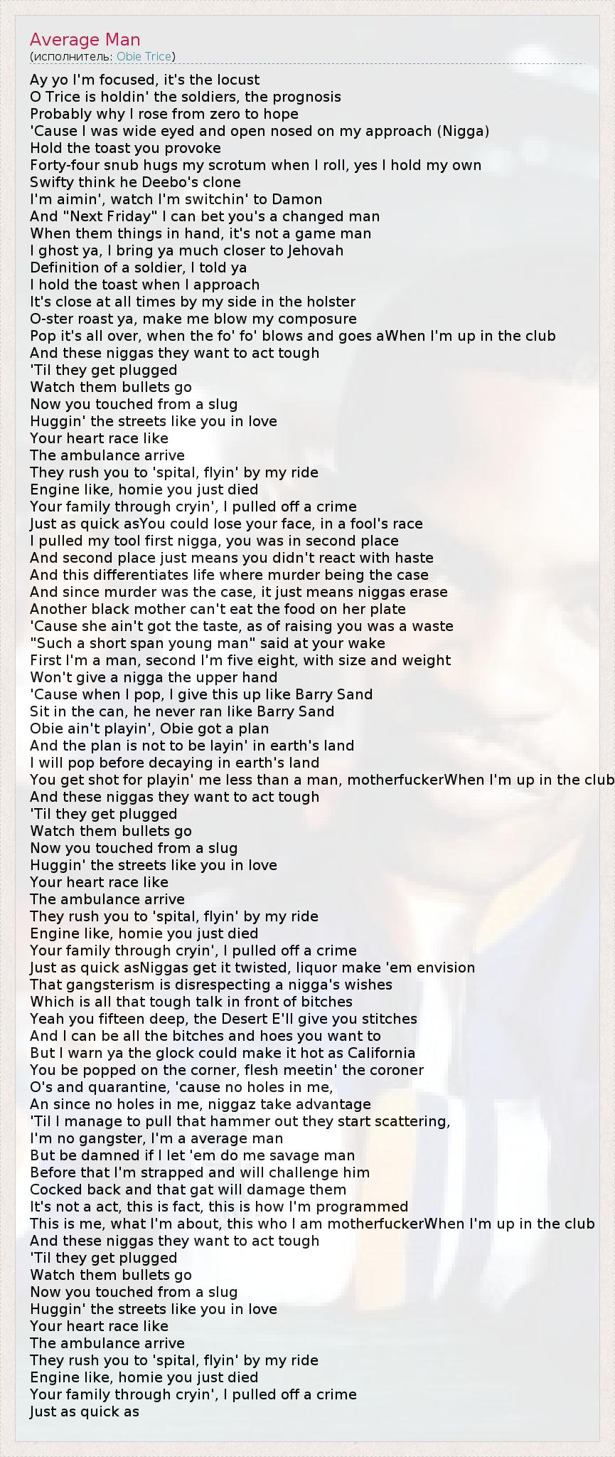 Это интересно:Возможно вы не поверите, но Оби Трайс – это настоящее имя Оби Трайса (об этом и речь идет в сэмпле). Понимаем, что это негоже нормальному рэпперу, но такое звучное имя менять на что-либо глупо. Всю свою жизнь Оби прожил в Детройте, чему, скажем прямо, и обязан своим нынешним положением.Свое приобщение к хип-хопу Трайс начал с банального караоке, подаренного мамой, когда мальчику исполнилось... продолжение