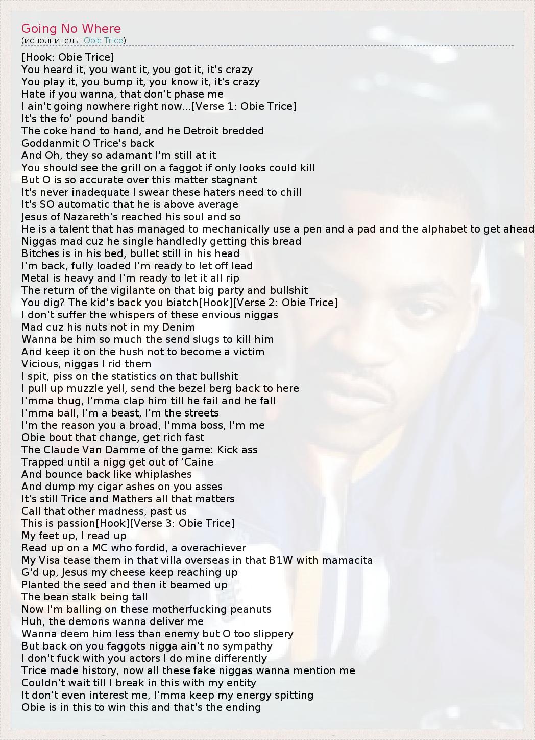 I ain't going nowhere right now...[Verse 1: Obie Trice]
