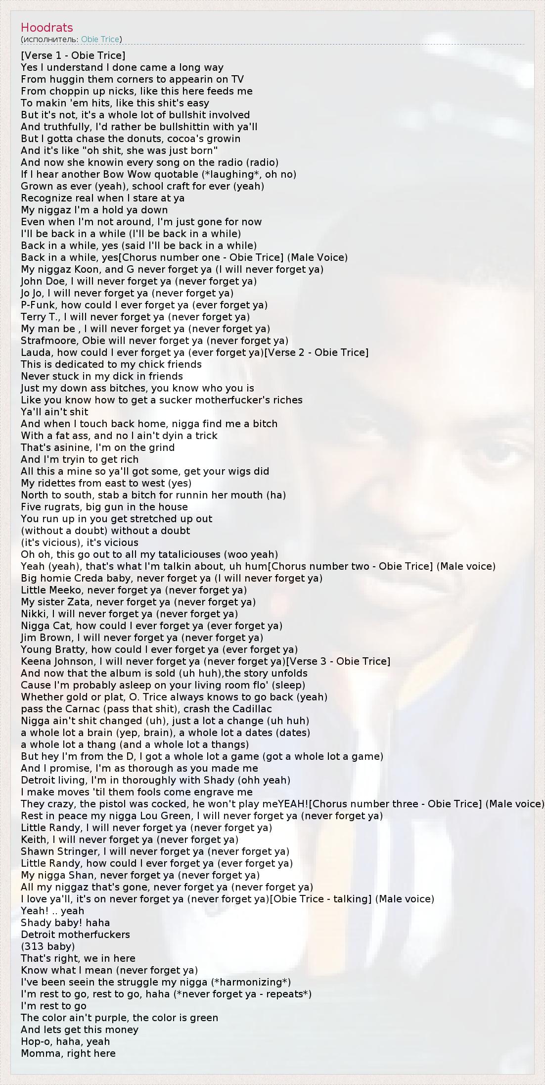 Это интересно:Возможно вы не поверите, но Оби Трайс – это настоящее имя Оби Трайса (об этом и речь идет в сэмпле). Понимаем, что это негоже нормальному рэпперу, но такое звучное имя менять на что-либо глупо. Всю свою жизнь Оби прожил в Детройте, чему, скажем прямо, и обязан своим нынешним положением.Свое приобщение к хип-хопу Трайс начал с банального караоке, подаренного мамой, когда мальчику исполнилось... продолжение