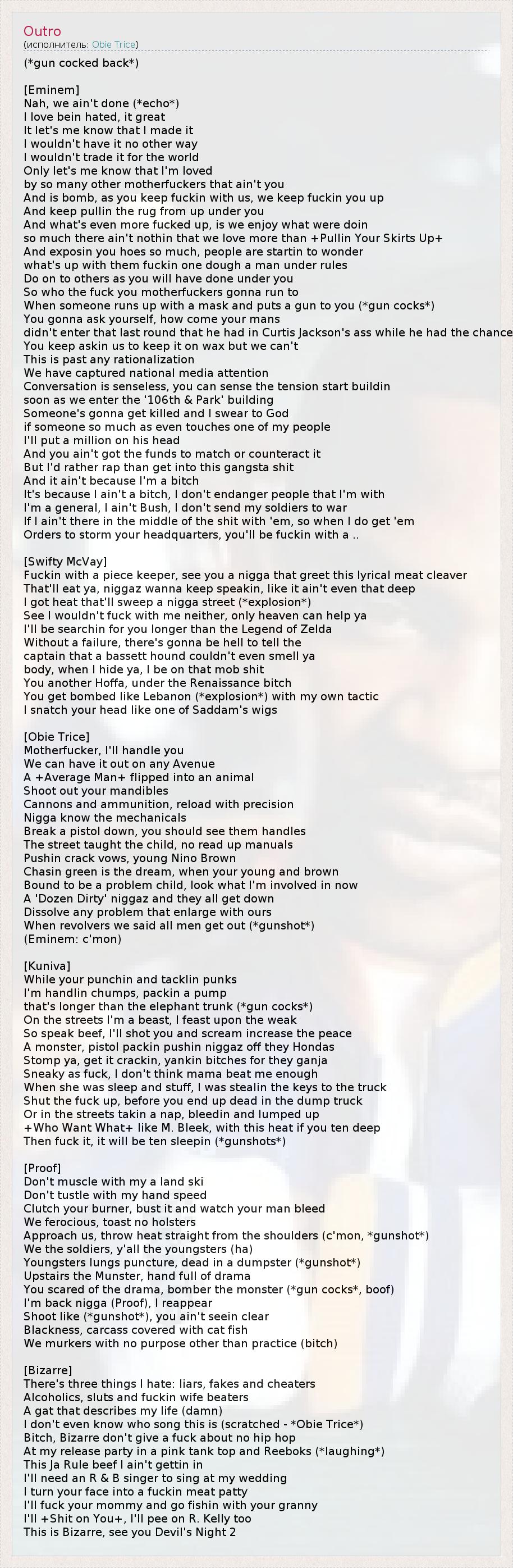 Это интересно:Возможно вы не поверите, но Оби Трайс – это настоящее имя Оби Трайса (об этом и речь идет в сэмпле). Понимаем, что это негоже нормальному рэпперу, но такое звучное имя менять на что-либо глупо. Всю свою жизнь Оби прожил в Детройте, чему, скажем прямо, и обязан своим нынешним положением.Свое приобщение к хип-хопу Трайс начал с банального караоке, подаренного мамой, когда мальчику исполнилось... продолжение