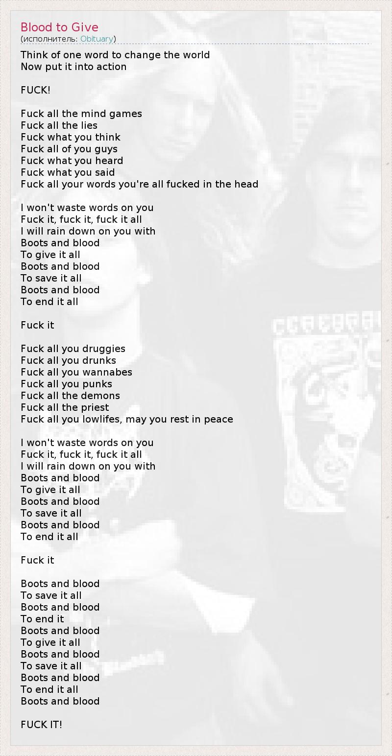 Think of one word to change the world Now put it into action FUCK! Fuck all the mind games Fuck all the lies Fuck what you think Fuck all of you guys Fuck what you heard Fuck what you said Fuck all your words you're all fucked in the head I won't waste words on you Fuck it, fuck it, fuck it all I will rain down on you with Boots and blood To give it all Boots and blood To save it all Boots and blood To end it all Fuck it Fuck all you druggies Fuck all you drunks Fuck all you wannabes Fuck all you punks Fuck all the demons Fuck all the priest Fuck all you lowlifes, may you rest in peace I won't waste words on you Fuck it, fuck it, fuck it all I will rain down on you with Boots and blood To give it all Boots and blood To save it all Boots and blood To end it all Fuck it Boots and blood To save it all Boots and blood To end it Boots and blood To give it all Boots and blood To save it all Boots and blood To end it all Boots and blood FUCK IT!