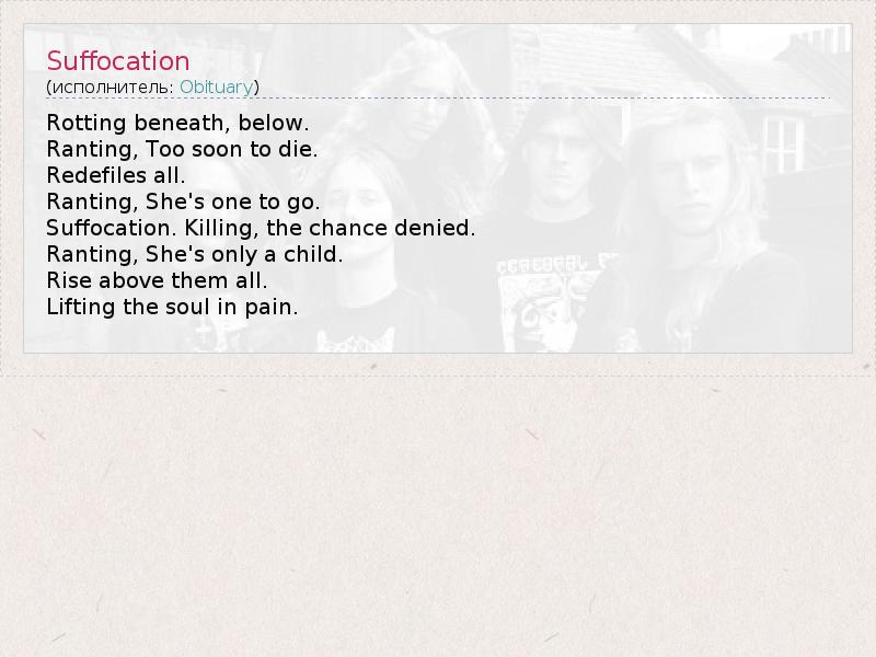 Rotting beneath, below. Ranting, Too soon to die. Redefiles all. Ranting, She's one to go. Suffocation. Killing, the chance denied. Ranting, She's only a child. Rise above them all. Lifting the soul in pain.