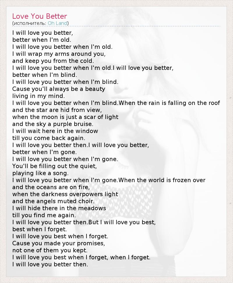 I will love you better, better when I'm old. I will love you better when I'm old. I will wrap my arms around you, and keep you from the cold. I will love you better when I'm old.I will love you better, better when I'm blind. I will love you better when I'm blind. Cause you'll always be a beauty living in my mind. I will love you better when I'm blind.When the rain is falling on the roof and the star are hid from view, when the moon is just a scar of light and the sky a purple bruise. I will wait here in the window till you come back again. I will love you better then.I will love you better, better when I'm gone. I will love you better when I'm gone. You'll be filling out the quiet, playing like a song. I will love you better when I'm gone.When the world is frozen over and the oceans are on fire, when the darkness overpowers light and the angels muted choir. I will hide there in the meadows till you find me again. I will love you better then.But I will love you best, best when I forget. I will love you best when I forget. Cause you made your promises, not one of them you kept. I will love you best when I forget, when I forget. I will love you better then.