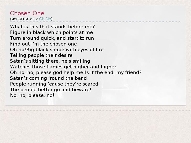 What is this that stands before me? Figure in black which points at me Turn around quick, and start to run Find out I'm the chosen one Oh no!Big black shape with eyes of fire Telling people their desire Satan's sitting there, he's smiling Watches those flames get higher and higher Oh no, no, please god help me!Is it the end, my friend? Satan's coming 'round the bend People running 'cause they're scared The people better go and beware! No, no, please, no!