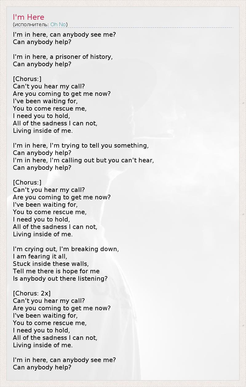I'm in here, can anybody see me? Can anybody help? I'm in here, a prisoner of history, Can anybody help? [Chorus:] Can't you hear my call? Are you coming to get me now? I've been waiting for, You to come rescue me, I need you to hold, All of the sadness I can not, Living inside of me. I'm in here, I'm trying to tell you something, Can anybody help? I'm in here, I'm calling out but you can't hear, Can anybody help? [Chorus:] Can't you hear my call? Are you coming to get me now? I've been waiting for, You to come rescue me, I need you to hold, All of the sadness I can not, Living inside of me. I'm crying out, I'm breaking down, I am fearing it all, Stuck inside these walls, Tell me there is hope for me Is anybody out there listening? [Chorus: 2x] Can't you hear my call? Are you coming to get me now? I've been waiting for, You to come rescue me, I need you to hold, All of the sadness I can not, Living inside of me. I'm in here, can anybody see me? Can anybody help?