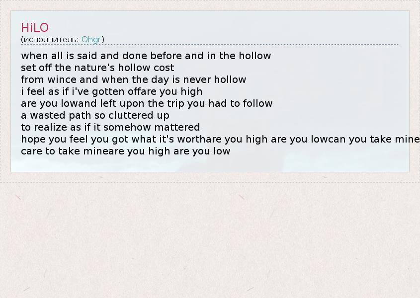 when all is said and done before and in the hollow set off the nature's hollow cost from wince and when the day is never hollow i feel as if i've gotten offare you high are you lowand left upon the trip you had to follow a wasted path so cluttered up to realize as if it somehow mattered hope you feel you got what it's worthare you high are you lowcan you take mine care to take mineare you high are you low