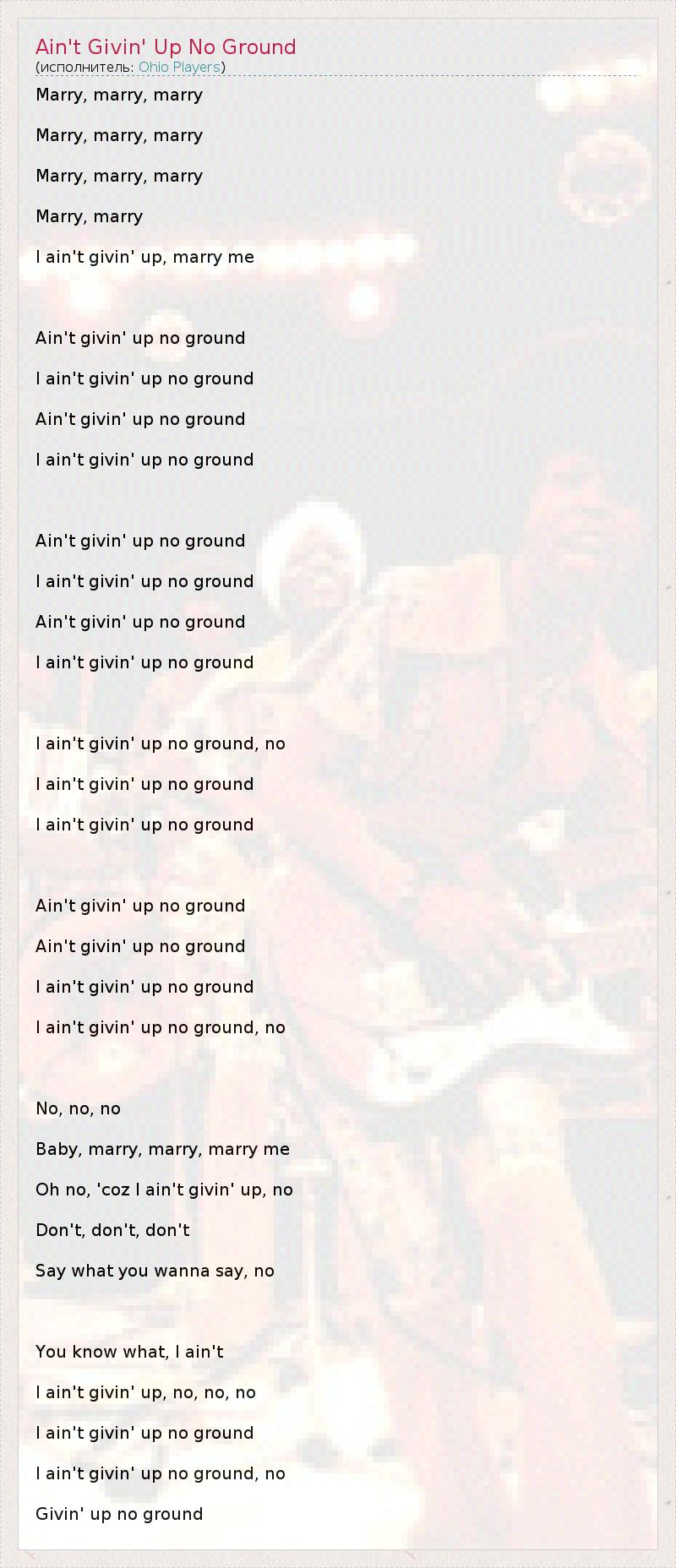 Marry, marry, marry Marry, marry, marry Marry, marry, marry Marry, marry I ain't givin' up, marry me Ain't givin' up no ground I ain't givin' up no ground Ain't givin' up no ground I ain't givin' up no ground Ain't givin' up no ground I ain't givin' up no ground Ain't givin' up no ground I ain't givin' up no ground I ain't givin' up no ground, no I ain't givin' up no ground I ain't givin' up no ground Ain't givin' up no ground Ain't givin' up no ground I ain't givin' up no ground I ain't givin' up no ground, no No, no, no Baby, marry, marry, marry me Oh no, 'coz I ain't givin' up, no Don't, don't, don't Say what you wanna say, no You know what, I ain't I ain't givin' up, no, no, no I ain't givin' up no ground I ain't givin' up no ground, no Givin' up no ground