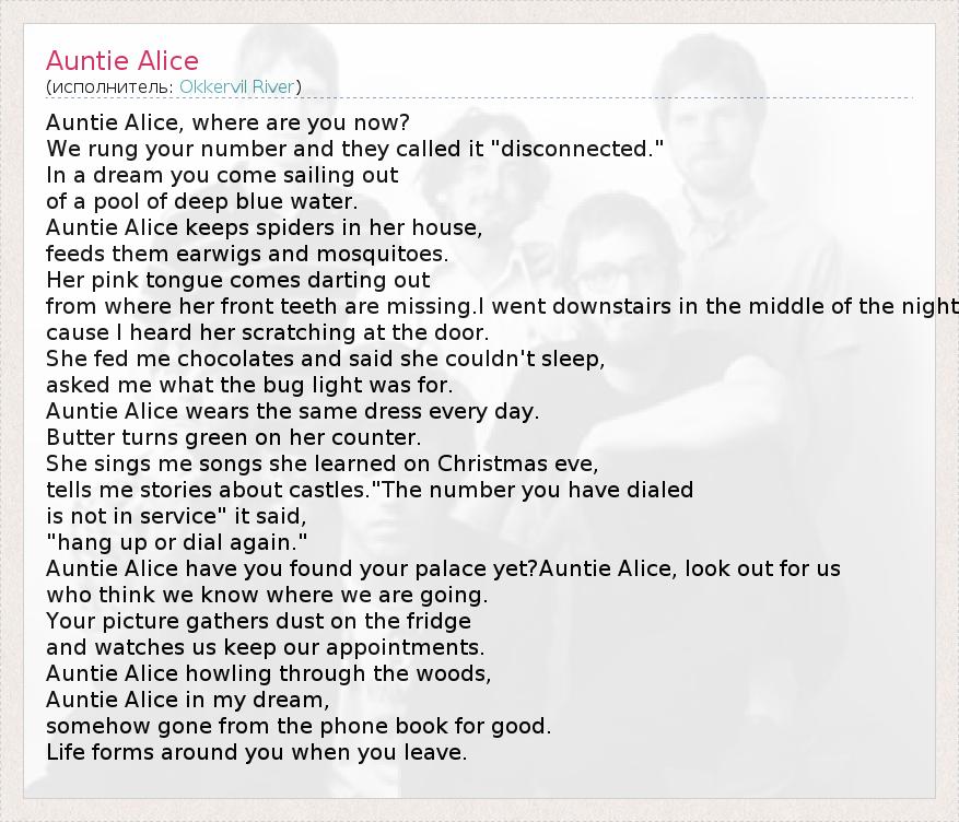 А как ты думаешь, о чем песня "Auntie Alice" ?