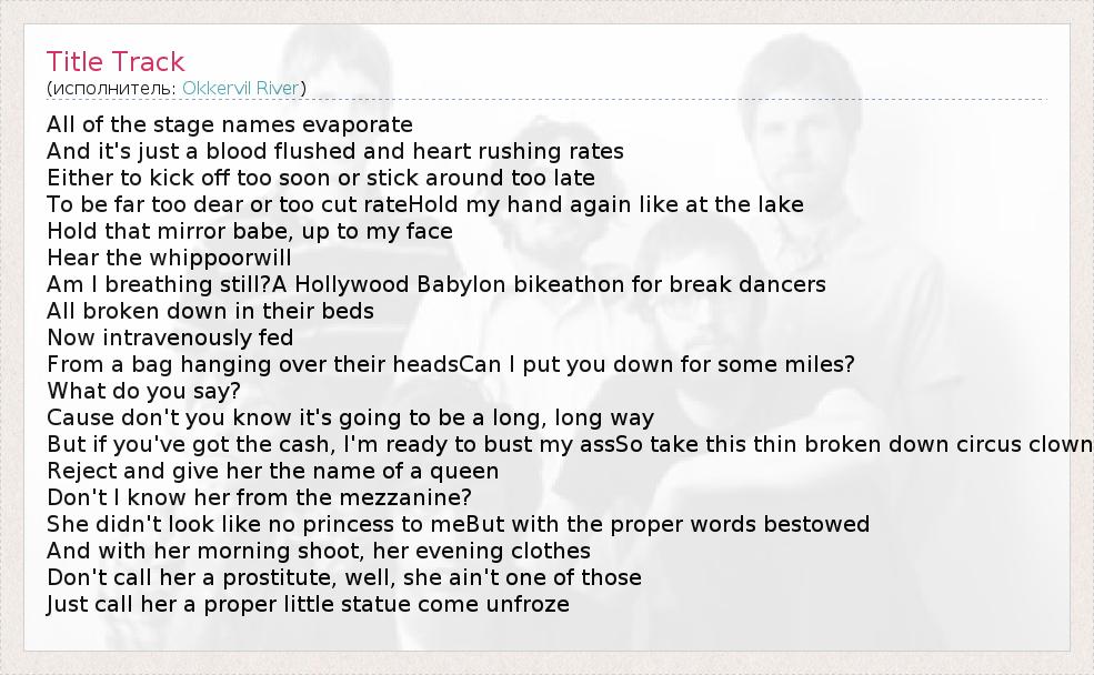 Это интересно:Okkervil River - группа, основанная в 1998 году в Остине, Техас, двумя школьными друзьями – Уиллом Шеффом (Will Robison Sheff) и Сетом Уорреном (Seth Warren). Группа получила свое название в честь рассказа Татьяны Толстой, Оккервиль – это название небольшой реки под Санкт-Петербургом, притока Невы. Первый альбом - Stars Too Small to Use – был записан группой за три дня летом 1998 года в маленькой остинской... продолжение