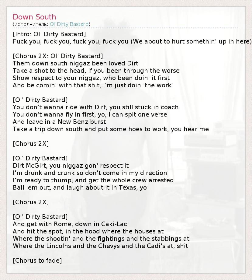 [Intro: Ol' Dirty Bastard] Fuck you, fuck you, fuck you, fuck you (We about to hurt somethin' up in here) [Chorus 2X: Ol' Dirty Bastard] Them down south niggaz been loved Dirt Take a shot to the head, if you been through the worse Show respect to your niggaz, who been doin' it first And be comin' with that shit, I'm just doin' the work [Ol' Dirty Bastard] You don't wanna ride with Dirt, you still stuck in coach You don't wanna fly in first, yo, I can spit one verse And leave in a New Benz burst Take a trip down south and put some hoes to work, you hear me [Chorus 2X] [Ol' Dirty Bastard] Dirt McGirt, you niggaz gon' respect it I'm drunk and crunk so don't come in my direction I'm ready to thump, and get the whole crew arrested Bail 'em out, and laugh about it in Texas, yo [Chorus 2X] [Ol' Dirty Bastard] And get with Rome, down in Caki-Lac And hit the spot, in the hood where the houses at Where the shootin' and the fightings and the stabbings at Where the Lincolns and the Chevys and the Cadi's at, shit [Chorus to fade]