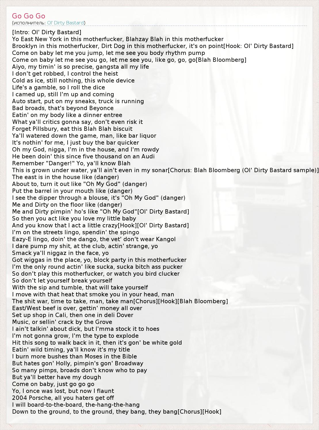 [Intro: Ol' Dirty Bastard] Yo East New York in this motherfucker, Blahzay Blah in this motherfucker Brooklyn in this motherfucker, Dirt Dog in this motherfucker, it's on point[Hook: Ol' Dirty Bastard] Come on baby let me you jump, let me see you body rhythm pump Come on baby let me see you go, let me see you, like go, go, go[Blah Bloomberg] Aiyo, my timin' is so precise, gangsta all my life I don't get robbed, I control the heist Cold as ice, still nothing, this whole device Life's a gamble, so I roll the dice I camed up, still I'm up and coming Auto start, put on my sneaks, truck is running Bad broads, that's beyond Beyonce Eatin' on my body like a dinner entree What ya'll critics gonna say, don't even risk it Forget Pillsbury, eat this Blah Blah biscuit Ya'll watered down the game, man, like bar liquor It's nothin' for me, I just buy the bar quicker Oh my God, nigga, I'm in the house, and I'm rowdy He been doin' this since five thousand on an Audi Remember "Danger!" Yo, ya'll know Blah This is grown under water, ya'll ain't even in my sonar[Chorus: Blah Bloomberg (Ol' Dirty Bastard sample)] The east is in the house like (danger) About to, turn it out like "Oh My God" (danger) Put the barrel in your mouth like (danger) I see the dipper through a blouse, it's "Oh My God" (danger) Me and Dirty on the floor like (danger) Me and Dirty pimpin' ho's like "Oh My God"[Ol' Dirty Bastard] So then you act like you love my little baby And you know that I act a little crazy[Hook][Ol' Dirty Bastard] I'm on the streets lingo, spendin' the spingo Eazy-E lingo, doin' the dango, the vet' don't wear Kangol I dare pump my shit, at the club, actin' strange, yo Smack ya'll niggaz in the face, yo Got wiggas in the place, yo, block party in this motherfucker I'm the only round actin' like sucka, sucka bitch ass pucker So don't play this motherfucker, or watch you bird clucker So don't let yourself break yourself With the sip and tumble, that will take yourself I move with that heat that smoke you in your head, man The shit war, time to take, man, take man[Chorus][Hook][Blah Bloomberg] East/West beef is over, gettin' money all over Set up shop in Cali, then one in deli Dover Music, or sellin' crack by the Grove I ain't talkin' about dick, but I'mma stock it to hoes I'm not gonna grow, I'm the type to explode Hit this song to walk back in it, then it's gon' be white gold Eatin' wild timing, ya'll know it's my title I burn more bushes than Moses in the Bible But hates gon' Holly, pimpin's gon' Broadway So many pimps, broads don't know who to pay But ya'll better have my dough Come on baby, just go go go Yo, I once was lost, but now I flaunt 2004 Porsche, all you haters get off I will board-to-the-board, the-hang-the-hang Down to the ground, to the ground, they bang, they bang[Chorus][Hook]