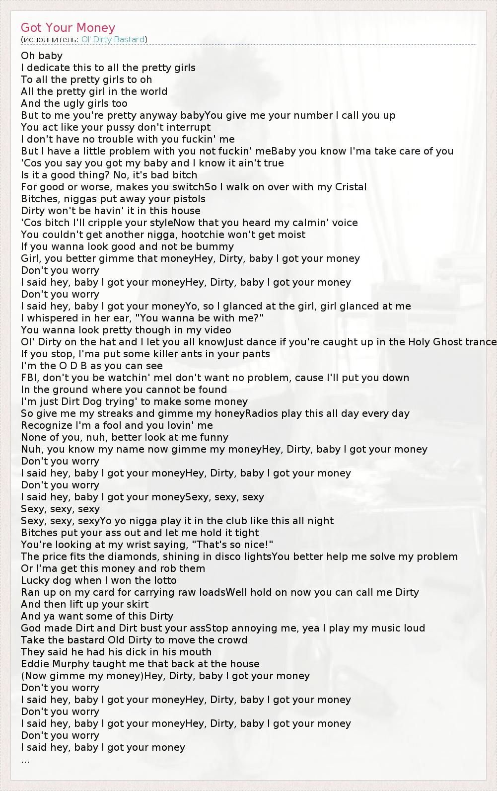 I said hey, baby I got your moneyHey, Dirty, baby I got your money
