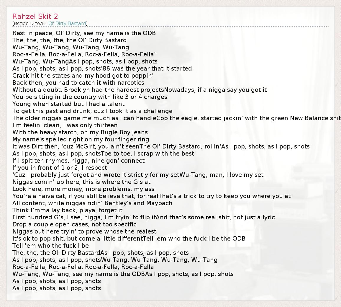 Rest in peace, Ol' Dirty, see my name is the ODB The, the, the, the, the Ol' Dirty Bastard Wu-Tang, Wu-Tang, Wu-Tang, Wu-Tang Roc-a-Fella, Roc-a-Fella, Roc-a-Fella, Roc-a-Fella" Wu-Tang, Wu-TangAs I pop, shots, as I pop, shots As I pop, shots, as I pop, shots'86 was the year that it started Crack hit the states and my hood got to poppin' Back then, you had to catch it with narcotics Without a doubt, Brooklyn had the hardest projectsNowadays, if a nigga say you got it You be sitting in the country with like 3 or 4 charges Young when started but I had a talent To get this past and drunk, cuz I took it as a challenge The older niggas game me much as I can handleCop the eagle, started jackin' with the green New Balance shit I'm feelin' clean, I was only thirteen With the heavy starch, on my Bugle Boy Jeans My name's spelled right on my four finger ring It was Dirt then, 'cuz McGirt, you ain't seenThe Ol' Dirty Bastard, rollin'As I pop, shots, as I pop, shots As I pop, shots, as I pop, shotsToe to toe, I scrap with the best If I spit ten rhymes, nigga, nine gon' connect If you in front of 1 or 2, I respect 'Cuz I probably just forgot and wrote it strictly for my setWu-Tang, man, I love my set Niggas comin' up here, this is where the G's at Look here, more money, more problems, my ass You're a naive cat, if you still believe that, for realThat's a trick to try to keep you where you at All content, while niggas ridin' Bentley's and Maybach Think I'mma lay back, playa, forget it First hundred G's, I see, nigga, I'm tryin' to flip itAnd that's some real shit, not just a lyric Drop a couple open cases, not too specific Niggas out here tryin' to prove whose the realest It's ok to pop shit, but come a little differentTell 'em who the fuck I be the ODB Tell 'em who the fuck I be The, the, the Ol' Dirty BastardAs I pop, shots, as I pop, shots As I pop, shots, as I pop, shotsWu-Tang, Wu-Tang, Wu-Tang, Wu-Tang Roc-a-Fella, Roc-a-Fella, Roc-a-Fella, Roc-a-Fella Wu-Tang, Wu-Tang, see my name is the ODBAs I pop, shots, as I pop, shots As I pop, shots, as I pop, shots As I pop, shots, as I pop, shots