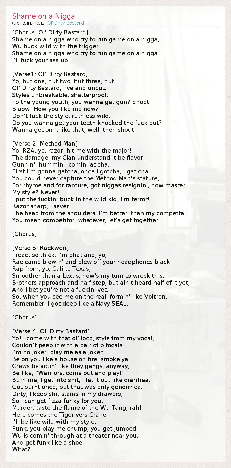 [Припев: Ol' Dirty Bastard] Позор черномазому, который пытается кинуть другого черномазого, Ву быкует, когда они берутся за пушки. Позор черномазому, который пытается кинуть другого черномазого. Я тебя отм**охаю! [Куплет 1: Ol' Dirty Bastard] Йоу, и-раз, и-два, и-три, есть! Олд Дёрти Бастард, вживую и без цензуры, Мой стиль несокрушимый и небьющийся, Обращаюсь к мелким малолеткам: хотите ствол? Получите! Ба-бах! Ну и как я вам теперь? Не до**ывайтесь до моего стиля, я беспощадный и дикий. Хотите, чтобы вам зубы выбили на х**? Хотите получить такое, ладно, тогда орите! [Куплет 2: Method Man] Йоу, Ризза, ты остр, как лезвие, давай мажорный лад! Увечье – мой Клан понимает, что это будет одолжением, Стреляем, бежим, прём на тебя, Сперва я доберусь до тебя, а когда доберусь, я зашмаляю тебя. Тебе никогда не сравняться с фигурой Метод Мэна Ни в рифмах, ни в отдаче, черномазые уходят в отставку, я теперь господин. Мой стиль? Никогда! Я наставлю гр**аную волыну на борзого парня, я ходячий ужас! Острый, как бритва, я снесу Голову с плеч, я лучше своих конкуриров, Хочешь сказать конкурентов – какая разница? А теперь вместе! [Припев] [Куплет 3: Raekwon] Я реагирую жёстко, я мощный парень и, йоу, Рэ пришёл, дунув, и снёс наушники с голов негров. Читатю рэп, йоу, от Калифорнии до Техаса, Я стелю мягче, чем "лексус", теперь моя очередь крушить. Братишки ценят это и снижают тон, но не слышали ещё и половины, И, спорим, ты ни х** не ветеран. Короче, когда вы увидите меня в жизни, я соберусь, как Вольтрон, 1 Помните: мои куплеты сильнее и глубже "морских котиков". [Припев] [Куплет 4: Ol' Dirty Bastard] Йоу! Я выступаю с безумным стилем своего вокала, Вам не рассмотреть его даже с парой бифокальных очков. Я не шут, будете так обращаться со мной – Я накинусь на вас, как огонь на дом, выкурю вас! Группы ведут себя, как настоящие банды, короче, Такие: "Воины, выходите и играйте!" Дайте мне прикурить, я начинаю читать, слова вылетают, как при диарее, Однажды я обжёгся, но это была простая гонорея. Дёрти, я не отстирываю пятна го**а с трусов, Так что могу напугать вас до у**ачки. Убийство, отведайте пламени Ву-Танг, р-ра! Это стиль тигра против стиля журавля, Я буду диким, как мой стиль. Ч**, считаешь меня тупым – затопчу тебя, Ву показывают в театре по соседству с тобой, От тебя будет вонять, как от обуви. Что? 1 – Вольтрон – трансформирующийся гигантский робот и название аниме-сериалов и серии комиксов про него.