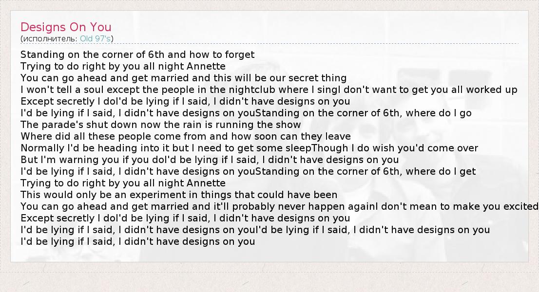 Standing on the corner of 6th and how to forget Trying to do right by you all night Annette You can go ahead and get married and this will be our secret thing I won't tell a soul except the people in the nightclub where I singI don't want to get you all worked up Except secretly I doI'd be lying if I said, I didn't have designs on you I'd be lying if I said, I didn't have designs on youStanding on the corner of 6th, where do I go The parade's shut down now the rain is running the show Where did all these people come from and how soon can they leave Normally I'd be heading into it but I need to get some sleepThough I do wish you'd come over But I'm warning you if you doI'd be lying if I said, I didn't have designs on you I'd be lying if I said, I didn't have designs on youStanding on the corner of 6th, where do I get Trying to do right by you all night Annette This would only be an experiment in things that could have been You can go ahead and get married and it'll probably never happen againI don't mean to make you excited Except secretly I doI'd be lying if I said, I didn't have designs on you I'd be lying if I said, I didn't have designs on youI'd be lying if I said, I didn't have designs on you I'd be lying if I said, I didn't have designs on you