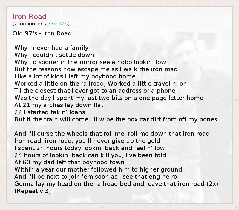 Old 97's - Iron Road Why I never had a family Why I couldn't settle down Why I'd sooner in the mirror see a hobo lookin' low But the reasons now escape me as I walk the iron road Like a lot of kids I left my boyhood home Worked a little on the railroad, Worked a little travelin' on Til the closest that I ever got to an address or a phone Was the day I spent my last two bits on a one page letter home At 21 my arches lay down flat 22 I started takin' loans But if the train will come I'll wipe the box car dirt from off my bones And I'll curse the wheels that roll me, roll me down that iron road Iron road, iron road, you'll never give up the gold I spent 24 hours today lookin' back and feelin' low 24 hours of lookin' back can kill you, I've been told At 60 my dad left that boyhood town Within a year our mother followed him to higher ground And I'll be next to join 'em soon as I see that engine roll Gonna lay my head on the railroad bed and leave that iron road (2x) (Repeat v.3)