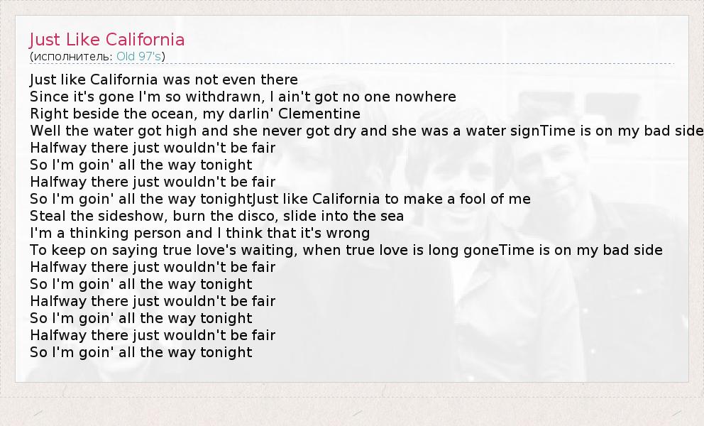 So I'm goin' all the way tonightJust like California to make a fool of me