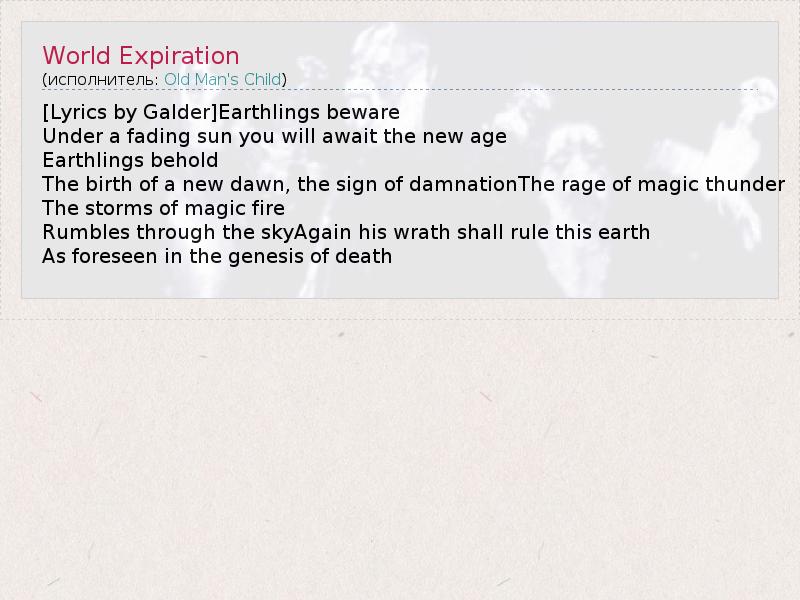 Это интересно:Норвежская black metal группа Old Man's Child была создана в 1993 году, однако её историю следует начать несколькими годами раньше…В 1989 году Галдер и Тьодалв создали группу REQUIEM, которая играла преимущественно материал таких групп как METALLICA и SLAYER. В 1993 году они даже издали одноименное демо, которое было напечатано тиражом в 50 экземпляров. После этого музыканты меняют название своего проекта... продолжение