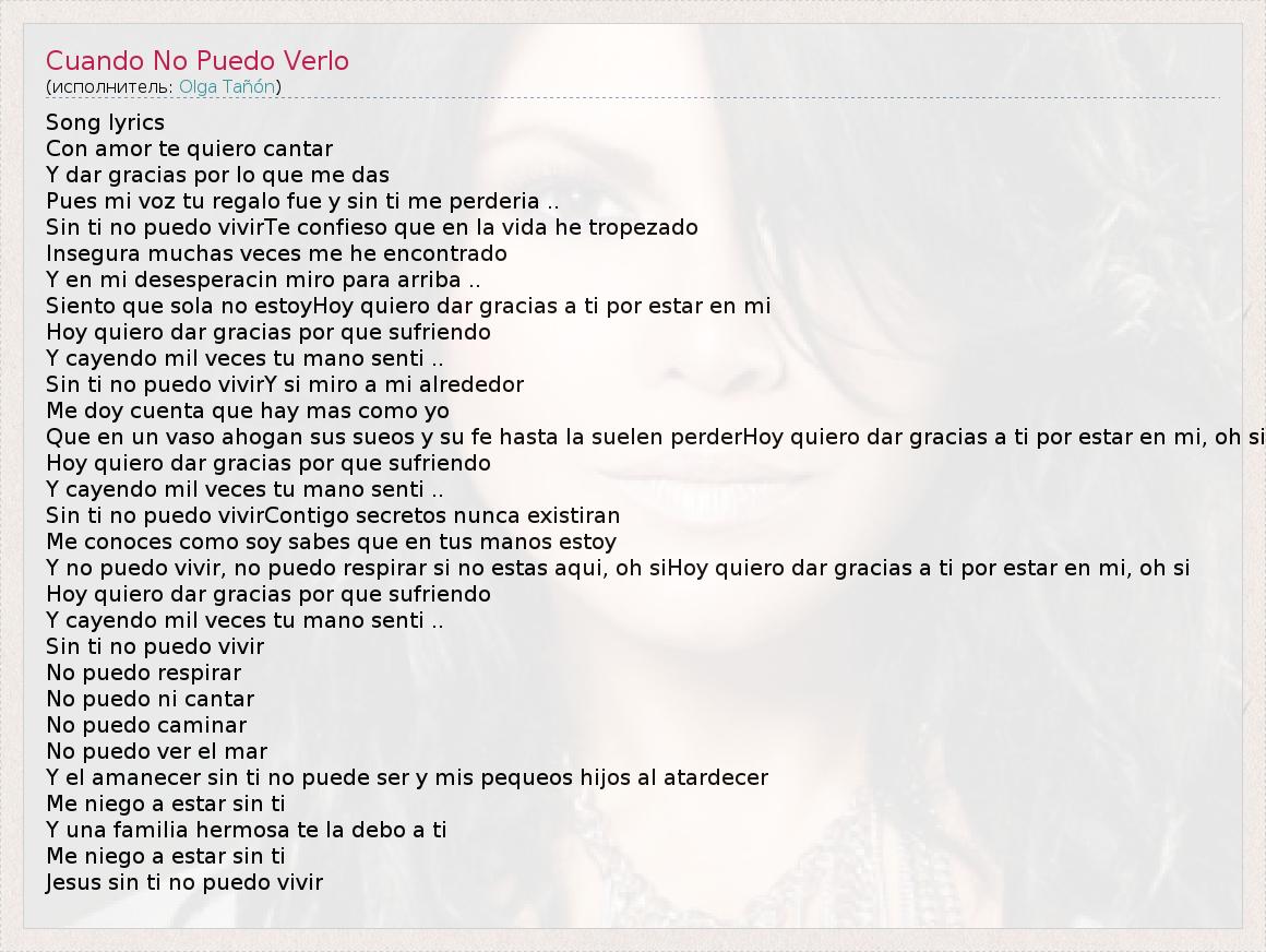 Song lyrics Con amor te quiero cantar Y dar gracias por lo que me das Pues mi voz tu regalo fue y sin ti me perderia .. Sin ti no puedo vivirTe confieso que en la vida he tropezado Insegura muchas veces me he encontrado Y en mi desesperacin miro para arriba .. Siento que sola no estoyHoy quiero dar gracias a ti por estar en mi Hoy quiero dar gracias por que sufriendo Y cayendo mil veces tu mano senti .. Sin ti no puedo vivirY si miro a mi alrededor Me doy cuenta que hay mas como yo Que en un vaso ahogan sus sueos y su fe hasta la suelen perderHoy quiero dar gracias a ti por estar en mi, oh si Hoy quiero dar gracias por que sufriendo Y cayendo mil veces tu mano senti .. Sin ti no puedo vivirContigo secretos nunca existiran Me conoces como soy sabes que en tus manos estoy Y no puedo vivir, no puedo respirar si no estas aqui, oh siHoy quiero dar gracias a ti por estar en mi, oh si Hoy quiero dar gracias por que sufriendo Y cayendo mil veces tu mano senti .. Sin ti no puedo vivir No puedo respirar No puedo ni cantar No puedo caminar No puedo ver el mar Y el amanecer sin ti no puede ser y mis pequeos hijos al atardecer Me niego a estar sin ti Y una familia hermosa te la debo a ti Me niego a estar sin ti Jesus sin ti no puedo vivir