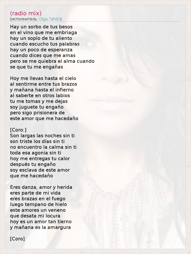 Это - глоток твоих поцелуев В вине, что меня опьяняет. Это - дуновение твоего дыхания, Когда я слушаю твои слова. Это - толика надежды, Когда ты говоришь, что любишь меня, Но душа рвется на части, когда Я понимаю, что ты меня обманываешь. Сегодня ты возносишь меня на небеса, что я ощущаю, находясь в твоих руках, А завтра я буду в аду, Зная, что ты будешь целовать другую. Ты то со мной, то оставляешь меня, Мне не нравится твоя ложь, Но я остаюсь заложницей этой любви, Что приносит мне страдания. [Припев:] Как же длинны ночи без тебя, Как же скучны дни без тебя, Я не нахожу покоя без тебя, Все тоскливо без тебя. Ты даешь мне свое тепло а, Затем обманываешь. Я - раба этой любви, Что приносит мне несчастье. Ты - танец, любовь и боль, Ты – часть моей жизни, Ты - жаркие объятия, А потом ты - корка льда. Твоя любовь – это яд, Что доводит меня до безумия. Сегодня любовь так нежна, А назавтра будет горько. [Припев]