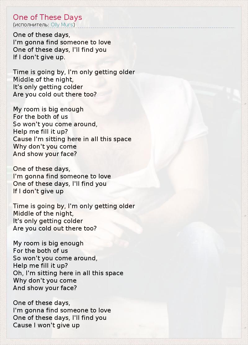 One of these days, I'm gonna find someone to love One of these days, I'll find you If I don't give up. Time is going by, I'm only getting older Middle of the night, It's only getting colder Are you cold out there too? My room is big enough For the both of us So won't you come around, Help me fill it up? Cause I'm sitting here in all this space Why don't you come And show your face? One of these days, I'm gonna find someone to love One of these days, I'll find you If I don't give up Time is going by, I'm only getting older Middle of the night, It's only getting colder Are you cold out there too? My room is big enough For the both of us So won't you come around, Help me fill it up? Oh, I'm sitting here in all this space Why don't you come And show your face? One of these days, I'm gonna find someone to love One of these days, I'll find you Cause I won't give up