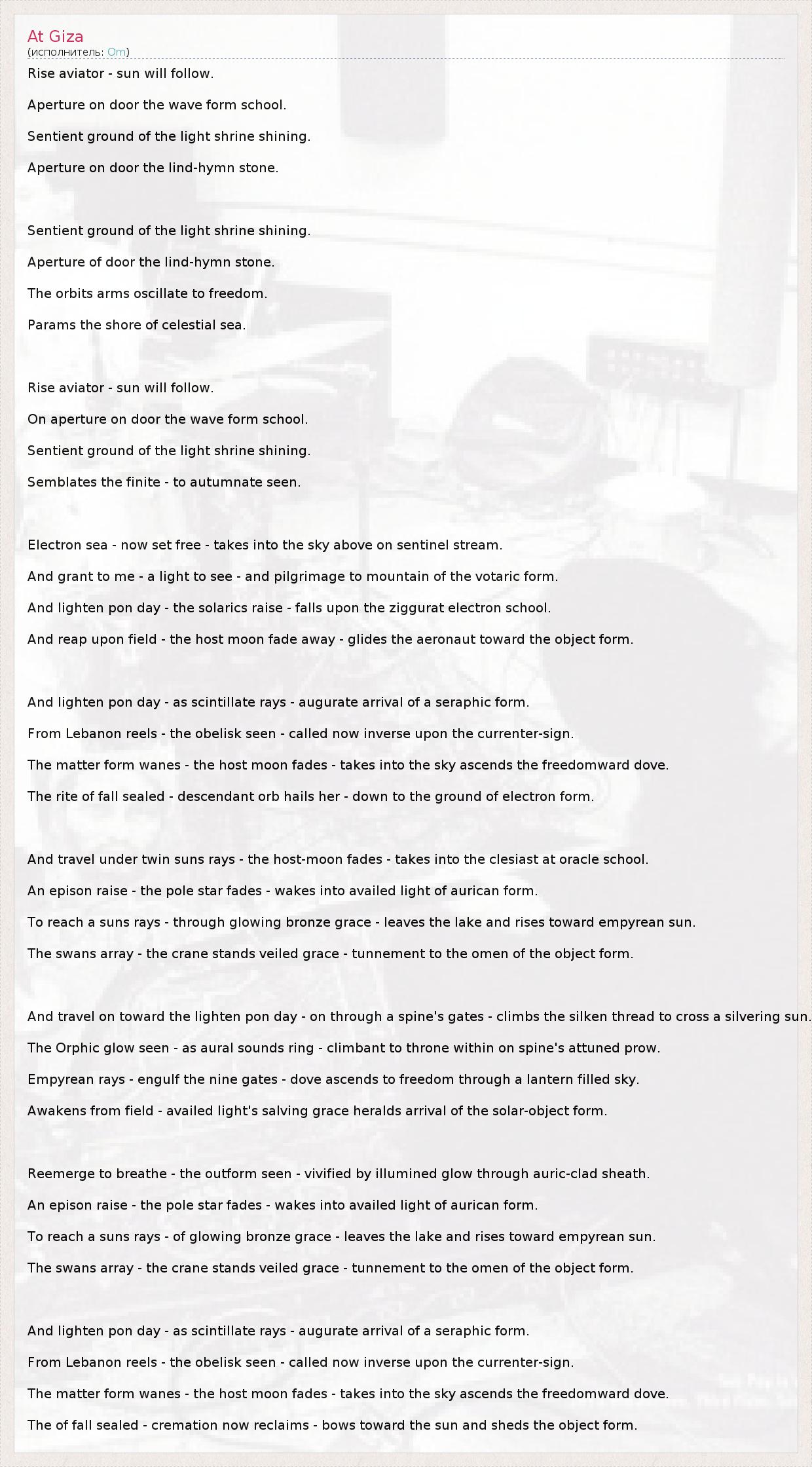 Rise aviator - sun will follow. Aperture on door the wave form school. Sentient ground of the light shrine shining. Aperture on door the lind-hymn stone. Sentient ground of the light shrine shining. Aperture of door the lind-hymn stone. The orbits arms oscillate to freedom. Params the shore of celestial sea. Rise aviator - sun will follow. On aperture on door the wave form school. Sentient ground of the light shrine shining. Semblates the finite - to autumnate seen. Electron sea - now set free - takes into the sky above on sentinel stream. And grant to me - a light to see - and pilgrimage to mountain of the votaric form. And lighten pon day - the solarics raise - falls upon the ziggurat electron school. And reap upon field - the host moon fade away - glides the aeronaut toward the object form. And lighten pon day - as scintillate rays - augurate arrival of a seraphic form. From Lebanon reels - the obelisk seen - called now inverse upon the currenter-sign. The matter form wanes - the host moon fades - takes into the sky ascends the freedomward dove. The rite of fall sealed - descendant orb hails her - down to the ground of electron form. And travel under twin suns rays - the host-moon fades - takes into the clesiast at oracle school. An epison raise - the pole star fades - wakes into availed light of aurican form. To reach a suns rays - through glowing bronze grace - leaves the lake and rises toward empyrean sun. The swans array - the crane stands veiled grace - tunnement to the omen of the object form. And travel on toward the lighten pon day - on through a spine's gates - climbs the silken thread to cross a silvering sun. The Orphic glow seen - as aural sounds ring - climbant to throne within on spine's attuned prow. Empyrean rays - engulf the nine gates - dove ascends to freedom through a lantern filled sky. Awakens from field - availed light's salving grace heralds arrival of the solar-object form. Reemerge to breathe - the outform seen - vivified by illumined glow through auric-clad sheath. An epison raise - the pole star fades - wakes into availed light of aurican form. To reach a suns rays - of glowing bronze grace - leaves the lake and rises toward empyrean sun. The swans array - the crane stands veiled grace - tunnement to the omen of the object form. And lighten pon day - as scintillate rays - augurate arrival of a seraphic form. From Lebanon reels - the obelisk seen - called now inverse upon the currenter-sign. The matter form wanes - the host moon fades - takes into the sky ascends the freedomward dove. The of fall sealed - cremation now reclaims - bows toward the sun and sheds the object form.