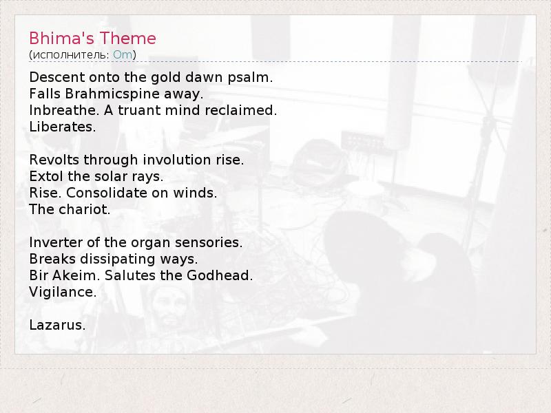 Это интересно:ОМ были сформированы Элом (Al Cisneros) и Крисом (Chris Hakius), оба основатели группы Sleep, легендарные пионеры дума. Они записали свой дебютник "Variations on a Theme" в 2004 году. Альбом был очень успешным и послужил предвестником триумфального возвращения Эла, который не появлялся на публике уже много лет. Андеграундная популярность группы привела к экслюзивным живым выступлениям в Лондоне, Нью-Йорке,Сан-Франциско... продолжение