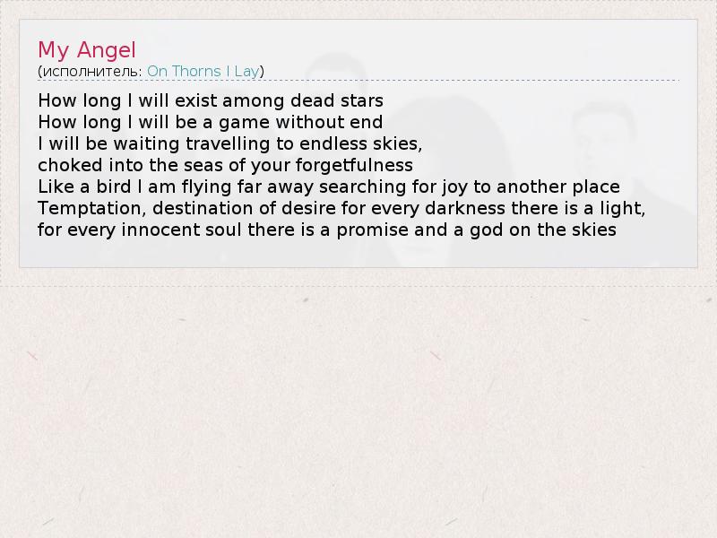 How long I will exist among dead stars How long I will be a game without end I will be waiting travelling to endless skies, choked into the seas of your forgetfulness Like a bird I am flying far away searching for joy to another place Temptation, destination of desire for every darkness there is a light, for every innocent soul there is a promise and a god on the skies