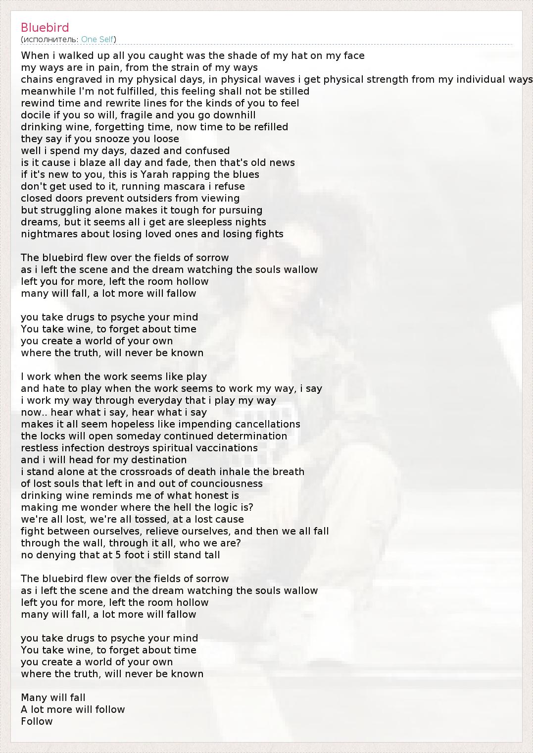 Когда я подошел все, что вы поймали был оттенок моей шляпы на моем лице мои пути от боли, от напряжения путях моих цепи , закрепленные в моих физических дней , в физических волн я получаю физическую силу от моих индивидуальных способов Между тем я не выполняется, это чувство не должно быть успокоены перемотки времени и переписать линии для тех видов вас чувствовать послушным , если вы так будет , хрупкая , и вы идете под гору пить вино , забывая время , теперь время, чтобы быть пополнен они говорят, что если вы прилегли вас свободно Ну, я провожу дни , кайфом и в смятении это потому что я полыхать весь день и исчезают , то это старые новости если это для вас в новинку , это Yarah рэп блюз Не привыкайте к нему , бег тушь я отказываюсь закрытые двери предотвращения несанкционированного от просмотра но изо всех сил само по себе делает его жестким для проведения мечты , но мне кажется, все это я получаю являются бессонные ночи кошмары о потери близких и потерять бои Синяя птица полетел над полями скорби как я покинул место происшествия и мечта смотреть души валяться оставил тебя больше, оставил пустоту номера многие будут падать, намного больше будет залежных Вы принимаете лекарства , чтобы психика свой ум Вы берете вино , чтобы забыть о времени Вы создаете свой собственный мир где правда , никогда не будет известно Я работаю , когда работа кажется игрой и очень не хочу играть , когда работа , кажется, работает мой путь , я говорю я работаю свой путь через каждый день , что я играю свой путь сейчас .. слушай, что я говорю , слушай, что я говорю, делает все это кажется безнадежным , как надвигающихся отмены замки откроет когда-нибудь продолжение решимость беспокойным инфекция разрушает духовные прививки и я буду двигаться к месту моего назначения I Stand Alone на перекрестке смерти вдыхать дыхания потерянных душ , которые оставили в и из counciousness пить вино напоминает мне о том, что честным заставляет меня задаться вопросом, где , черт возьми, логика ? мы все потеряли, мы все бросил , на безнадежное дело бороться между собой , снять самих себя, и тогда мы все падают через стену , через все это , кто мы? Нельзя отрицать, что в 5 футов , я все еще не стоять в полный рост Синяя птица полетел над полями скорби как я покинул место происшествия и мечта смотреть души валяться оставил тебя больше, оставил пустоту номера многие будут падать, намного больше будет залежных Вы принимаете лекарства , чтобы психика свой ум Вы берете вино , чтобы забыть о времени Вы создаете свой собственный мир где правда , никогда не будет известно Многие упадет Намного больше будет следовать следовать