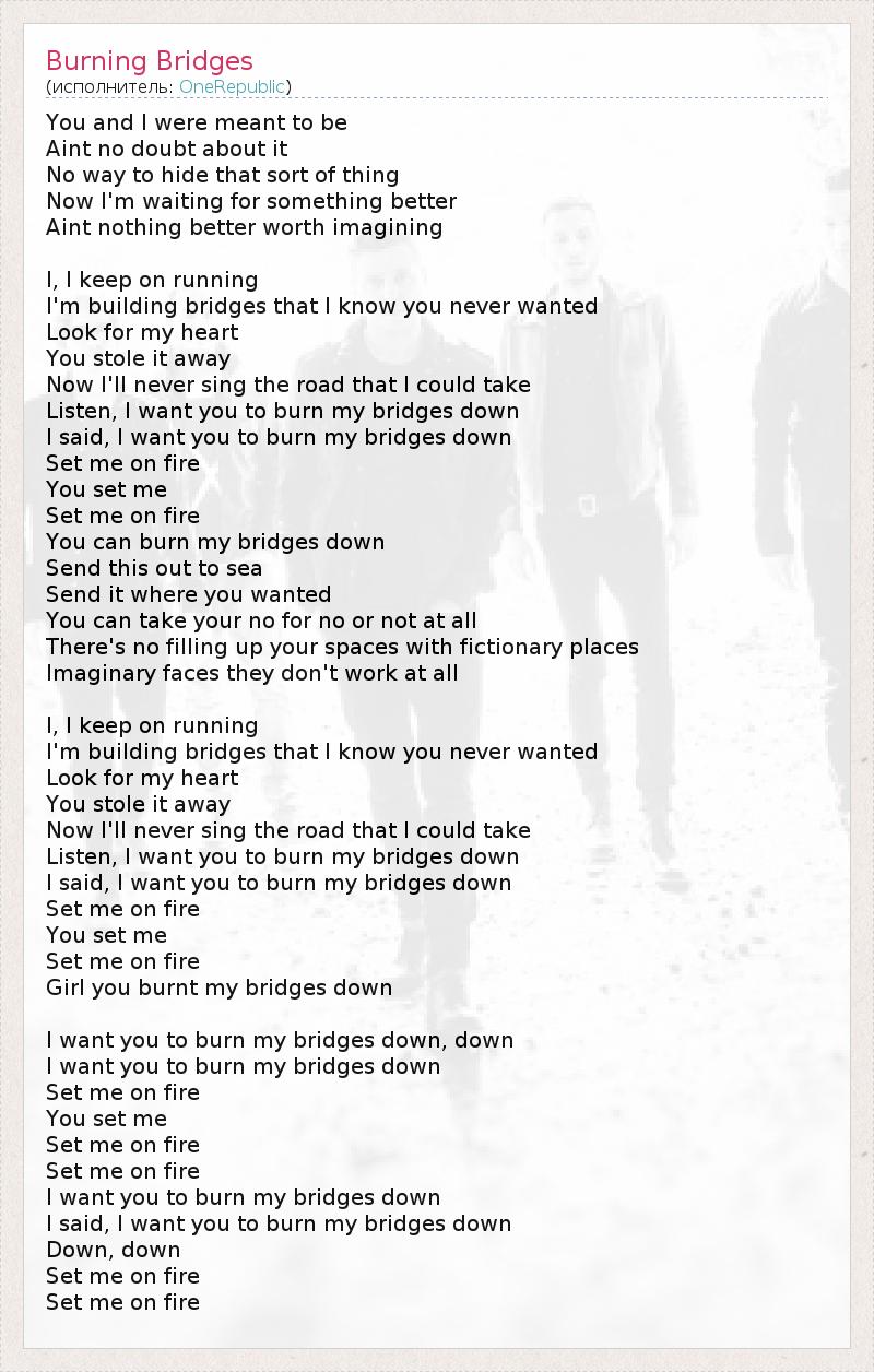 Мы с тобой были созданы друг для друга, В этом нет никаких сомнений, Подобное не утаишь. Теперь я жду чего-то лучшего, Хотя вряд ли можно вообразить нечто прекраснее. Я продолжаю убегать, Строя мосты, которых ты никогда не хотела. Поищи моё сердце, Ты украла его, И теперь я никогда не запою о дороге, которую мог выбрать. Послушай, я хочу, чтобы ты сожгла мои мосты, Повторяю, я хочу, чтобы ты сожгла мои мосты. Предала меня огню, Ты предала, Предала меня огню. Можешь сжечь мои мосты, Выброси всё в море Или туду, куда хотела. Можешь забрать свои "Нет", означающие "Нет" или "Вовсе нет". Твою пустоту не заполнить выдуманным пространством, Воображаемые лица ничего не дадут. Я продолжаю убегать, Строя мосты, которых ты никогда не хотела. Поищи моё сердце, Ты украла его, И теперь я никогда не запою о дороге, которую мог выбрать. Послушай, я хочу, чтобы ты сожгла мои мосты, Повторяю, я хочу, чтобы ты сожгла мои мосты. Предала меня огню, Ты предала, Предала меня огню. Девочка, ты сожгла мои мосты... Я хочу, чтобы ты сожгла мои мосты, Я хочу, чтобы ты сожгла мои мосты. Предала меня огню, Ты предала, Предала меня огню, Предала меня огню. Я хочу, чтобы ты сожгла мои мосты, Повторяю, я хочу, чтобы ты сожгла мои мосты Дотла, дотла. Предай меня огню, Предай меня огню...