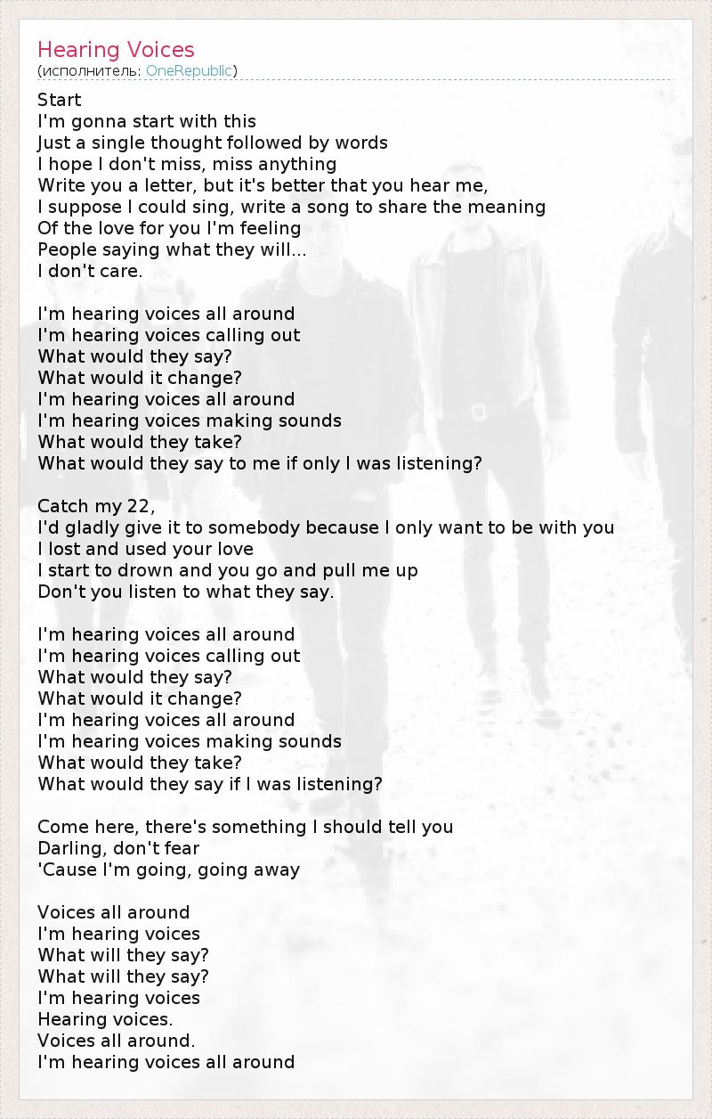 Начнём, Я начну с этого, С одной мысли, выраженной в словах. Надеюсь, ты не пропустишь, не пропустишь ничего. Я бы написал тебе письмо, но лучше, если ты меня услышишь, Мне кажется, я мог бы спеть, написать песню, чтобы донести в ней смысл Всей любви к тебе, которая во мне живёт. Люди говорят, чего они желают… Мне это безразлично. Я слышу голоса везде вокруг, Я слышу, как эти голоса взывают. Что они скажут мне? И что это изменит? Я слышу голоса везде вокруг, Я слышу шум от этих голосов, Какой выбор они бы сделали? О чём бы они сказали мне, если бы я слушал их? Сел на свой «двадцать второй», Я с радостью отдал бы его кому-нибудь, ведь я хочу быть только с тобой. Я истратил и потерял твою любовь, Я начинаю тонуть, приди и вытащи меня, Не слушай, что они там говорят. Я слышу голоса везде вокруг, Я слышу, как эти голоса взывают. Что они скажут мне? И что это изменит? Я слышу голоса везде вокруг, Я слышу шум от этих голосов, Какой выбор они бы сделали? О чём бы они сказали мне, если бы я слушал их? Иди сюда, я должен кое-что сказать тебе, Не бойся, дорогая, Потому что я уже ухожу, ухожу… Голоса везде вокруг, Я слышу голоса. Что они скажут мне? Что они скажут мне? Я слышу голоса, Слышу голоса, Голоса повсюду, Я слышу голоса повсюду…