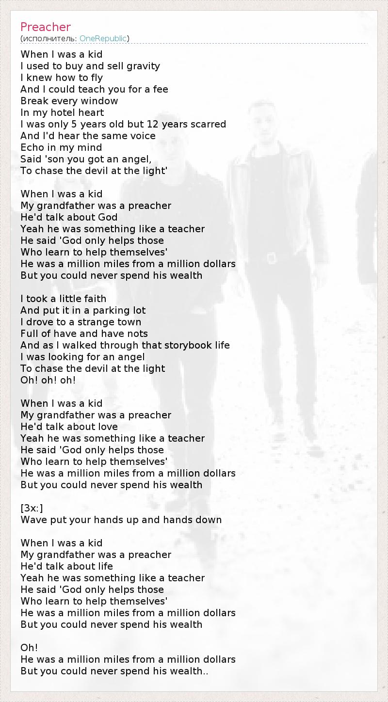 Когда я был ребенком, Я обесценивал силу притяжения. Я умел летать И мог бы научить тебя теперь за отдельную плату. Разбил все окна В своём сердце-отеле, Мне было всего пять, а шрамы получил двенадцатилетнего. Я слышал один и тот же голос, Раздающийся эхом у меня в голове. Он говорил: "Сынок, у тебя есть ангел, Он прогонит дьявола своим светом." Когда я был ребенком, Мой дедушка был проповедником. Он говорил о Боге. Да, он был кем-то наподобие учителя. Он говорил, что Бог помогает лишь тем, Кто учится помогать себе сам. 1 Он был за миллион миль от миллиона долларов, Но его богатство было неистощимо. Я взял немного веры И оставил ее на стоянке. Я поехал в незнакомый город, Полный и богатых, и бедных. И, ступая по страницам этой книги жизни, Я искал ангела, Что прогнал бы дьявола своим светом, О-о... Когда я был ребенком, Мой дедушка был проповедником. Он говорил о любви. Да, он был кем-то наподобие учителя. Он говорил, что Бог помогает лишь тем, Кто учится помогать себе сам. Он был за миллион миль от миллиона долларов, Но его богатство было неистощимо. [3x:] Пускаем волну! Поднимите руки вверх и опустите вниз! Когда я был ребенком, Мой дедушка был проповедником. Он говорил о жизни. Да, он был кем-то наподобие учителя. Он говорил, что Бог помогает лишь тем, Кто учится помогать себе сам. Он был за миллион миль от миллиона долларов, Но его богатство было неистощимо. О, Он был за миллион миль от миллиона долларов, Но его богатство было неистощимо... 1 - перифраз поговорки: На Бога надейся, и сам не плошай / Везёт тому, кто сам везёт