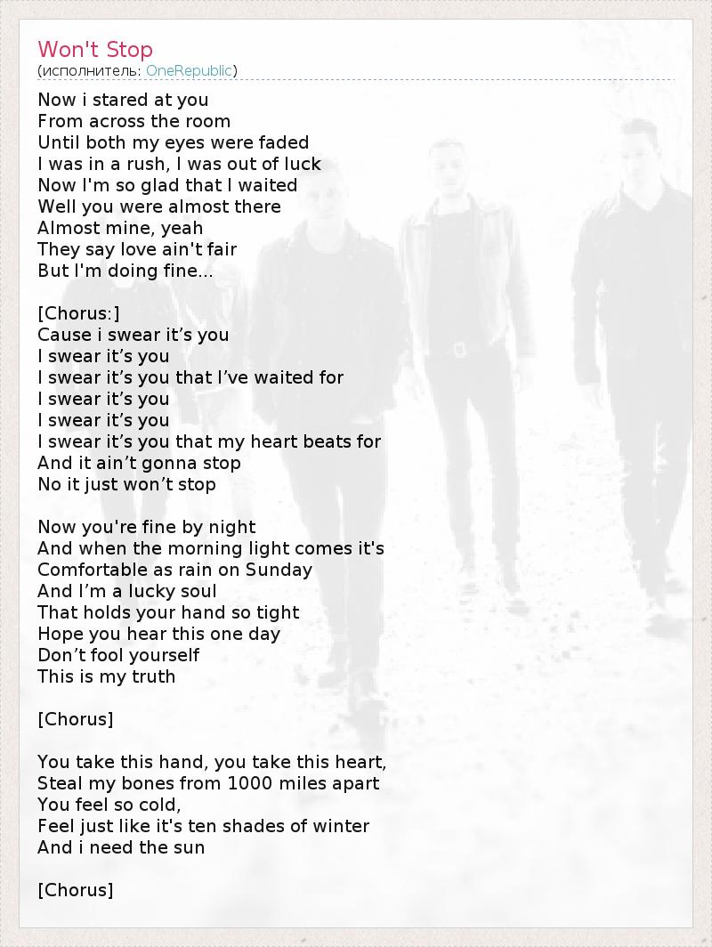 Now i stared at you From across the room Until both my eyes were faded I was in a rush, I was out of luck Now I'm so glad that I waited Well you were almost there Almost mine, yeah They say love ain't fair But I'm doing fine... [Chorus:] Cause i swear it’s you I swear it’s you I swear it’s you that I’ve waited for I swear it’s you I swear it’s you I swear it’s you that my heart beats for And it ain’t gonna stop No it just won’t stop Now you're fine by night And when the morning light comes it's Comfortable as rain on Sunday And I’m a lucky soul That holds your hand so tight Hope you hear this one day Don’t fool yourself This is my truth [Chorus] You take this hand, you take this heart, Steal my bones from 1000 miles apart You feel so cold, Feel just like it's ten shades of winter And i need the sun [Chorus]
