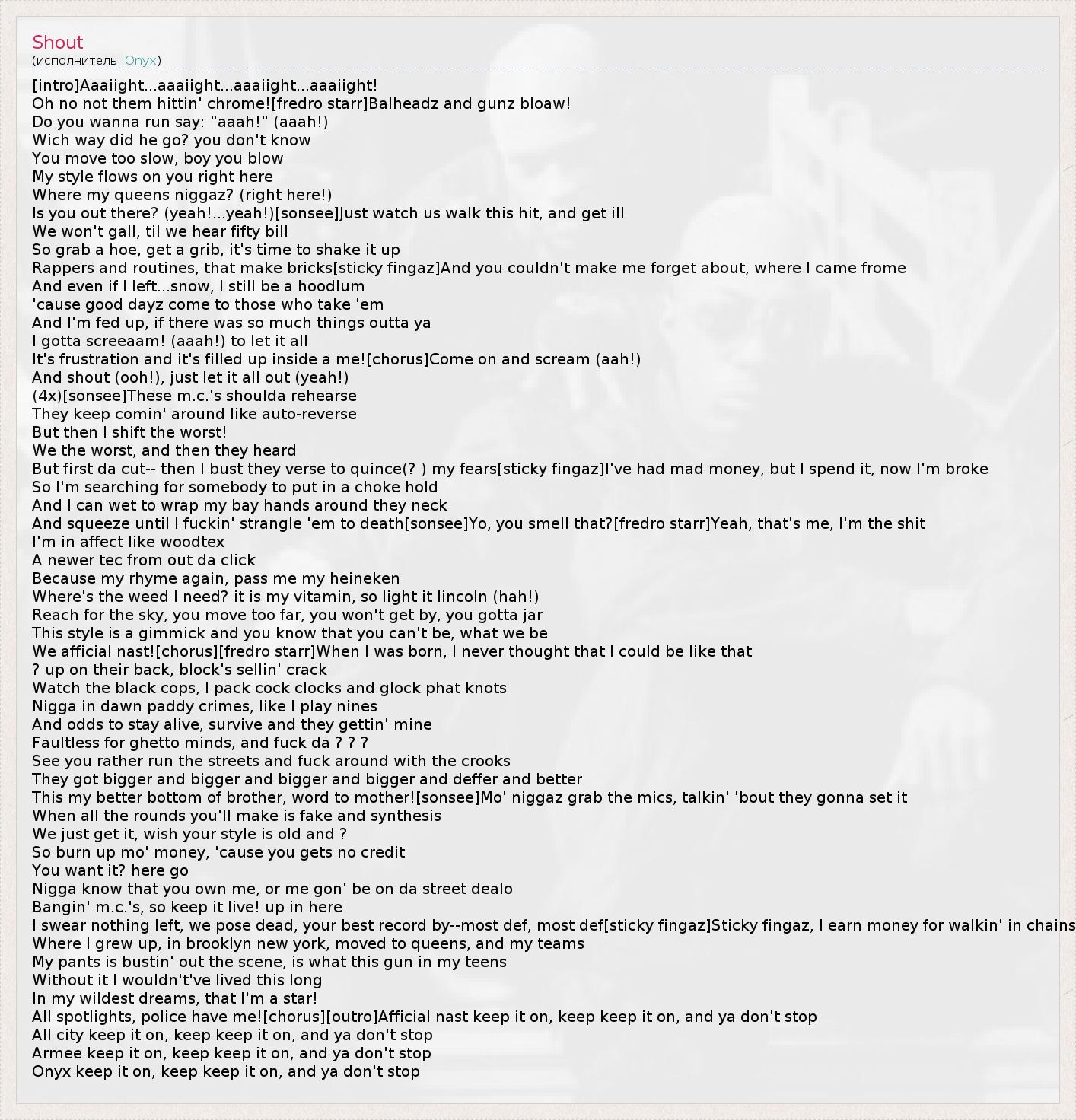 Это интересно:Состав группыSonny Seeza ака Suave: Настоящее имя - Tyrone Taylor;Fredro Starr: Настоящее имя - Fred Scruggs;Sticky Fingaz: Настоящие имя - Kirk Jones;Big DS (В группе до 1994 года), 22 мая 2003 скончался от рака.В этом мире существует множество вещей, имеющих под собой не постоянную основу. Гораздо меньше существует того, что вкладывают в понятие "настоящее".... продолжение