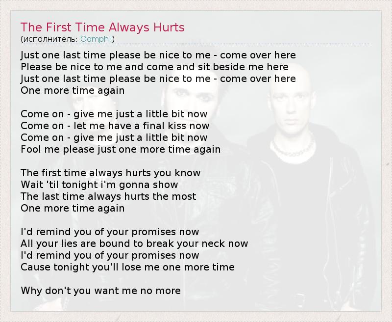 В последний раз, прошу, будь со мной мила – подойди сюда, Пожалуйста, будь мила и подойди, и сядь рядом со мной, Лишь в последний раз, прошу, будь со мной мила, подойди сюда, Еще один разок. Ну же, подари мне сейчас совсем чуть-чуть, Ну же, позволь мне сейчас последний поцелуй, Ну же, подари мне сейчас совсем чуть-чуть, Обмани меня, пожалуйста, еще один раз. В первый раз всегда больно, Подожди до ночи, и я покажу тебе. Но больней всего – в последний раз. Еще разок. Я бы сейчас напомнил тебе обо всех твоих обещаниях, Вся твоя ложь сейчас обязательно свернет тебе шею. Я бы сейчас напомнил тебе обо всех твоих обещаниях, Ведь сегодня ночью ты еще раз потеряешь меня. Почему ты больше не хочешь меня?
