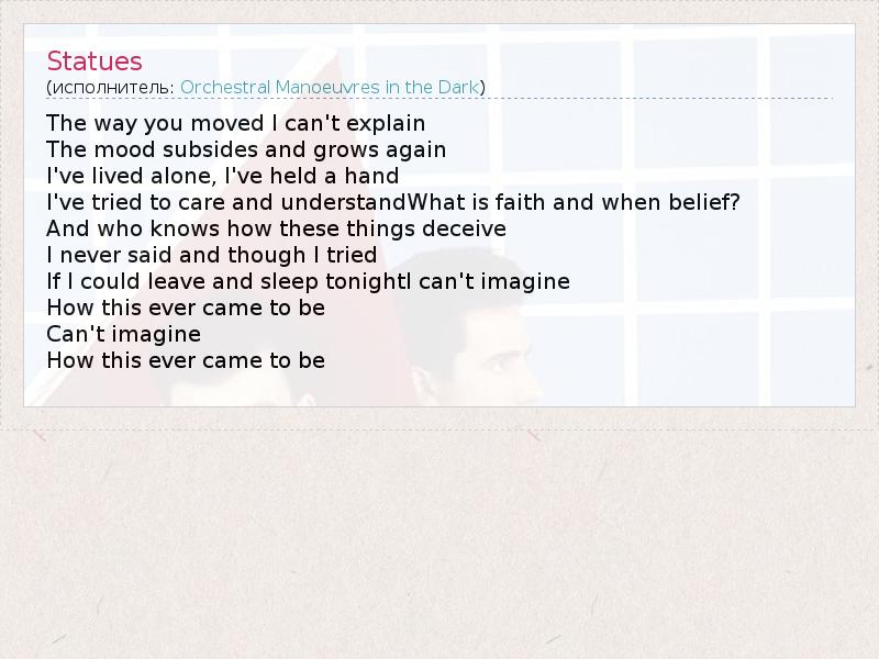 The way you moved I can't explain The mood subsides and grows again I've lived alone, I've held a hand I've tried to care and understandWhat is faith and when belief? And who knows how these things deceive I never said and though I tried If I could leave and sleep tonightI can't imagine How this ever came to be Can't imagine How this ever came to be