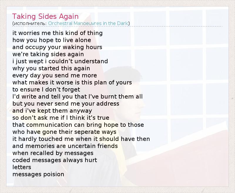 А как ты думаешь, о чем песня "Taking Sides Again" ?