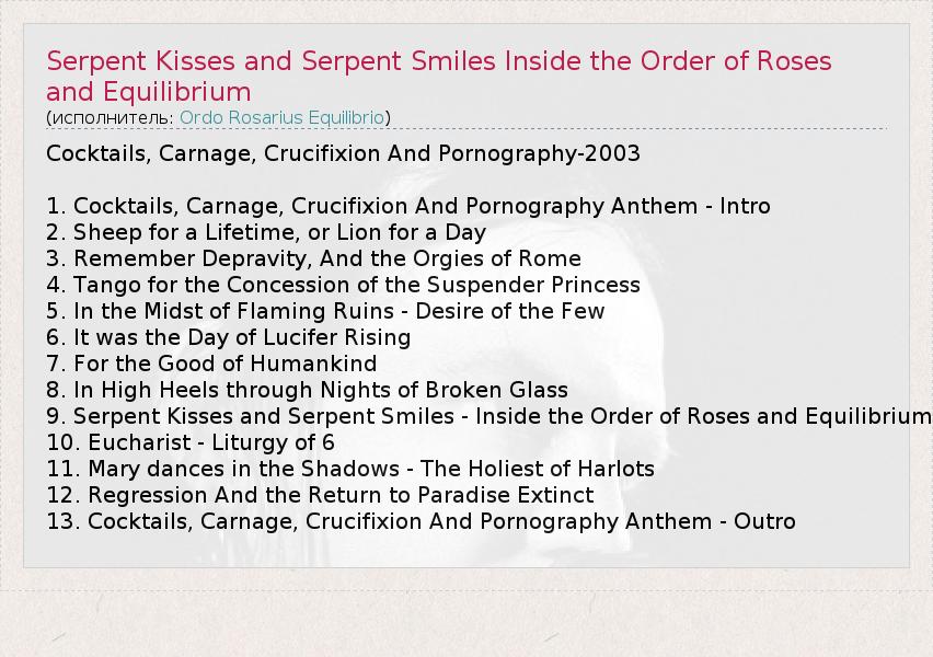 ГлавнаяИсполнителиOrdo Rosarius EquilibrioSerpent Kisses and Serpent Smiles Inside the Order of Roses and Equilibrium