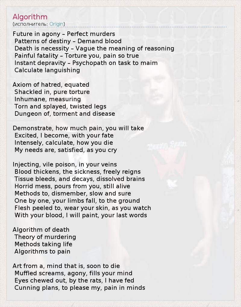 Это интересно:Американская группа из города Топика, Канзас, играющая в стиле Technical Brutal Death Metal.Тематика творчества этой воистину жестокой группы: мизантропия, смерть, эзотерика.Origin была сформирована в 1997 году гитаристом/вокалистом Полом Райаном и гитаристом Джереми Тернером. Вскоре к ним присоединился Клинт Эпплханц (бас), Марк Мэннинг (вокал) и Джордж Флук (ударные).23 мая 1998 года группа отыграла... продолжение