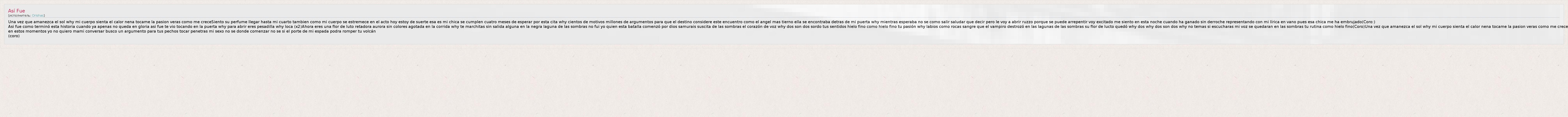 Una vez que amanezca el sol why mi cuerpo sienta el calor nena tocame la pasion veras como me creceSiento su perfume llegar hasta mi cuarto tambien como mi cuerpo se estremece en el acto hoy estoy de suerte esa es mi chica se cumplen cuatro meses de esperar por esta cita why cientos de motivos millones de argumentos para que el destino considere este encuentro como el angel mas tierno ella se encontraba detras de mi puerta why mientras esperaba no se como salir saludar que decir pero le voy a abrir ruzzo porque se puede arrepentir voy excitado me siento en esta noche cuando ha ganado sin derroche representando con mi lírica en vano pues esa chica me ha embrujado(Coro:) Asi fue como terminó esta historia cuando ya apenas no queda en gloria asi fue te vio tocando en la puerta why para abrir eres pesadilla why loca (x2)Ahora eres una flor de luto retadora aurora sin colores agotada en la corrida why te marchitas sin salida alguna en la negra laguna de las sombras no fui yo quien esta batalla comenzó por dios samurais suscita de las sombras el corazón de voz why dos son dos sordo tus sentidos hielo fino como hielo fino tu pasión why labios como rocas sangre que el vampiro destrozó en las lagunas de las sombras su flor de lucto quedó why dos why dos son dos why no temas si escucharas mi voz se quedaran en las sombras tu rutina como hielo fino(Coro)Una vez que amanezca el sol why mi cuerpo sienta el calor nena tocame la pasion veras como me crece en estos momentos yo no quiero mami conversar busco un argumento para tus pechos tocar penetras mi sexo no se donde comenzar no se si el porte de mi espada podra romper tu volcán (coro)