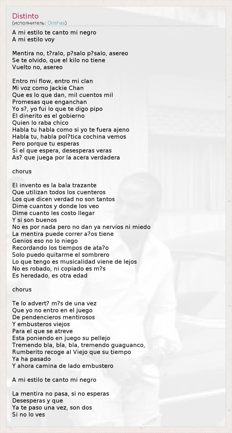 A mi estilo te canto mi negro A mi estilo voy Mentira no, t?ralo, p?salo p?salo, asereo Se te olvido, que el kilo no tiene Vuelto no, asereo Entro mi flow, entro mi clan Mi voz como Jackie Chan Que es lo que dan, mil cuentos mil Promesas que enganchan Yo s?, yo fui lo que te digo pipo El dinerito es el gobierno Quien lo raba chico Habla tu habla como si yo te fuera ajeno Habla tu, habla pol?tica cochina vemos Pero porque tu esperas Si el que espera, desesperas veras As? que juega por la acera verdadera chorus El invento es la bala trazante Que utilizan todos los cuenteros Los que dicen verdad no son tantos Dime cuantos y donde los veo Dime cuanto les costo llegar Y si son buenos No es por nada pero no dan ya nervios ni miedo La mentira puede correr a?os tiene Genios eso no lo niego Recordando los tiempos de ata?o Solo puedo quitarme el sombrero Lo que tengo es musicalidad viene de lejos No es robado, ni copiado es m?s Es heredado, es otra edad chorus Te lo advert? m?s de una vez Que yo no entro en el juego De pendencieros mentirosos Y embusteros viejos Para el que se atreve Esta poniendo en juego su pellejo Tremendo bla, bla, bla, tremendo guaguanco, Rumberito recoge al Viejo que su tiempo Ya ha pasado Y ahora camina de lado embustero A mi estilo te canto mi negro La mentira no pasa, si no esperas Desesperas y que Ya te paso una vez, son dos Si no lo ves