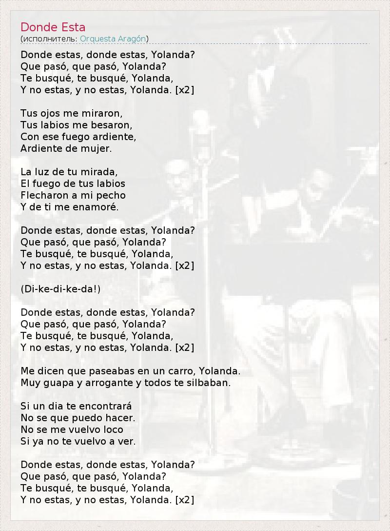 Где ты, где же ты, Иоланда? Что случилось, что случилось, Иоланда? Я искал тебя, искал тебя, Иоланда, Но тебя здесь нет, тебя нет, Иоланда. [x2] Твои глаза смотрели в мои, Твои губы целовали меня С такой пламенной страстью, Страстью женщины. Искры твоего взгляда, Огонь твоих губ, Пустили стрелы в моё сердце, и Я полюбил тебя. Где ты, где же ты, Иоланда? Что случилось, что случилось, Иоланда? Я искал тебя, искал тебя, Иоланда, Но тебя здесь нет, тебя нет, Иоланда. [x2] (Тики-тики-так!) Где ты, где же ты, Иоланда? Что случилось, что случилось, Иоланда? Я искал тебя, искал тебя, Иоланда, Но тебя здесь нет, тебя нет, Иоланда. [x2] Говорят, что ты каталась на какой-то машине, Иоланда. Такая красивая и высокомерная, и все свистели тебе вслед. Если однажды наткнусь на тебя, Даже не знаю, что cдела.. Наверное, я сойду с ума, Если снова тебя не увижу. Где ты, где же ты, Иоланда? Что случилось, что случилось, Иоланда? Я искал тебя, искал тебя, Иоланда, Но тебя здесь нет, тебя нет, Иоланда. [x2]