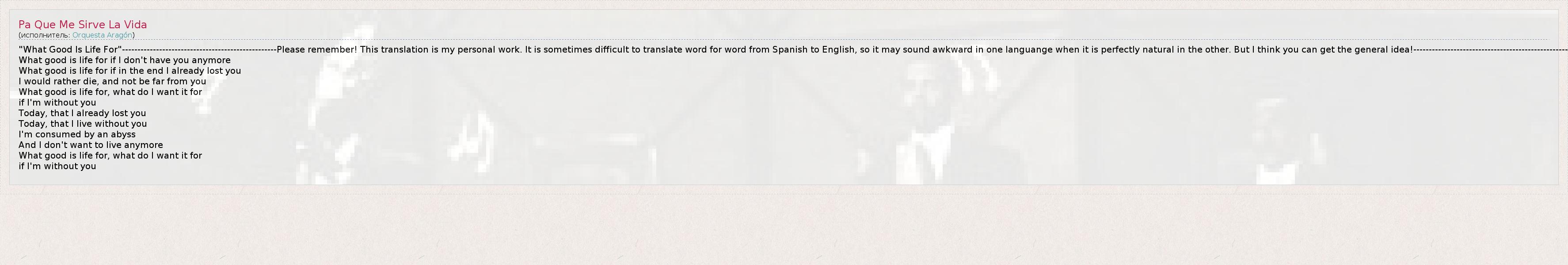 "What Good Is Life For"--------------------------------------------------Please remember! This translation is my personal work. It is sometimes difficult to translate word for word from Spanish to English, so it may sound awkward in one languange when it is perfectly natural in the other. But I think you can get the general idea!--------------------------------------------------