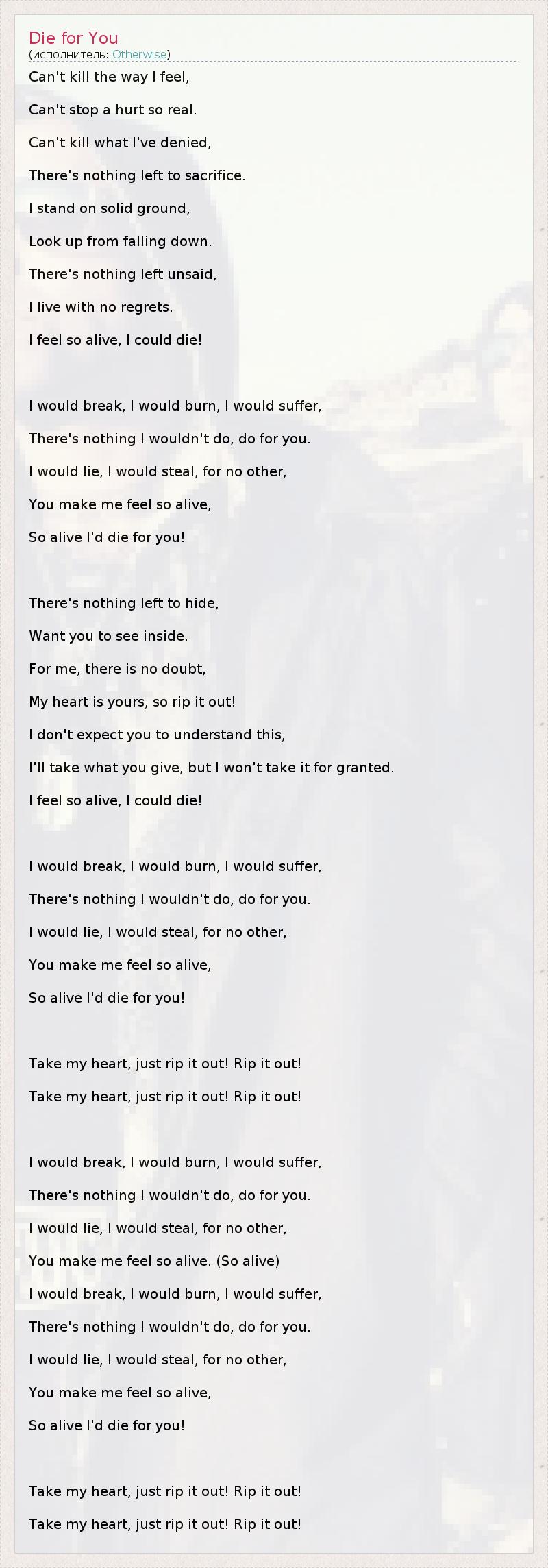 Can't kill the way I feel, Can't stop a hurt so real. Can't kill what I've denied, There's nothing left to sacrifice. I stand on solid ground, Look up from falling down. There's nothing left unsaid, I live with no regrets. I feel so alive, I could die! I would break, I would burn, I would suffer, There's nothing I wouldn't do, do for you. I would lie, I would steal, for no other, You make me feel so alive, So alive I'd die for you! There's nothing left to hide, Want you to see inside. For me, there is no doubt, My heart is yours, so rip it out! I don't expect you to understand this, I'll take what you give, but I won't take it for granted. I feel so alive, I could die! I would break, I would burn, I would suffer, There's nothing I wouldn't do, do for you. I would lie, I would steal, for no other, You make me feel so alive, So alive I'd die for you! Take my heart, just rip it out! Rip it out! Take my heart, just rip it out! Rip it out! I would break, I would burn, I would suffer, There's nothing I wouldn't do, do for you. I would lie, I would steal, for no other, You make me feel so alive. (So alive) I would break, I would burn, I would suffer, There's nothing I wouldn't do, do for you. I would lie, I would steal, for no other, You make me feel so alive, So alive I'd die for you! Take my heart, just rip it out! Rip it out! Take my heart, just rip it out! Rip it out!