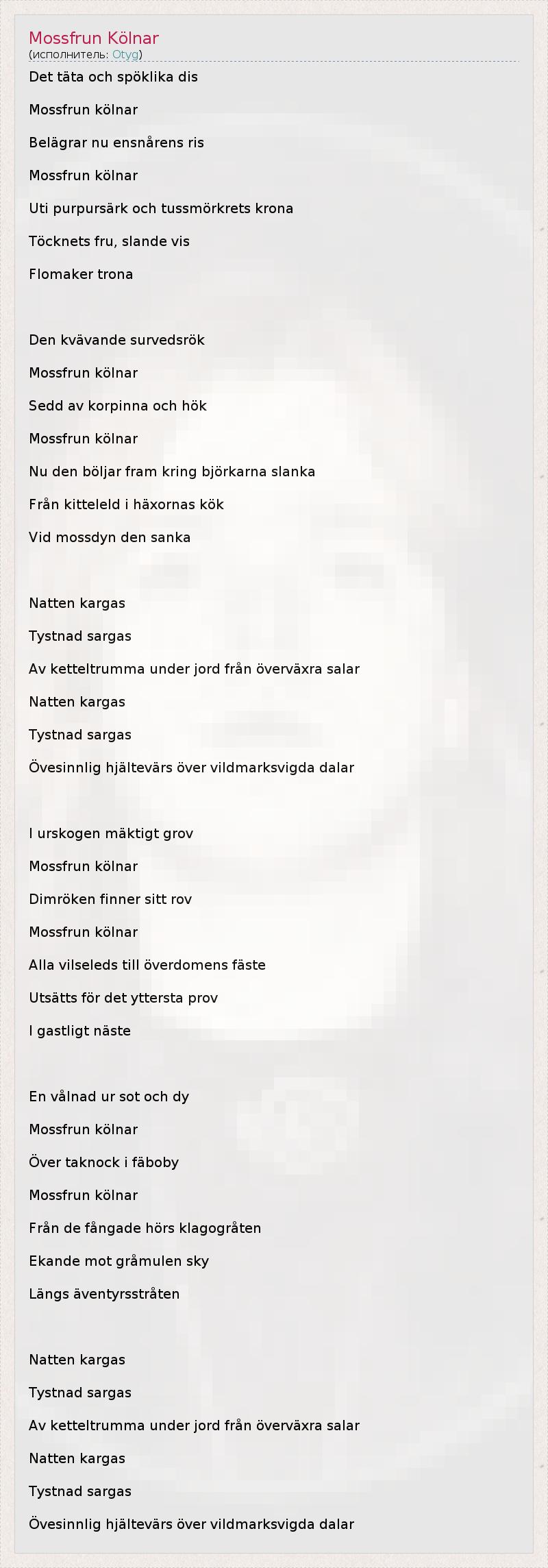Det täta och spöklika dis Mossfrun kölnar Belägrar nu ensnårens ris Mossfrun kölnar Uti purpursärk och tussmörkrets krona Töcknets fru, slande vis Flomaker trona Den kvävande survedsrök Mossfrun kölnar Sedd av korpinna och hök Mossfrun kölnar Nu den böljar fram kring björkarna slanka Från kitteleld i häxornas kök Vid mossdyn den sanka Natten kargas Tystnad sargas Av ketteltrumma under jord från överväxra salar Natten kargas Tystnad sargas Övesinnlig hjältevärs över vildmarksvigda dalar I urskogen mäktigt grov Mossfrun kölnar Dimröken finner sitt rov Mossfrun kölnar Alla vilseleds till överdomens fäste Utsätts för det yttersta prov I gastligt näste En vålnad ur sot och dy Mossfrun kölnar Över taknock i fäboby Mossfrun kölnar Från de fångade hörs klagogråten Ekande mot gråmulen sky Längs äventyrsstråten Natten kargas Tystnad sargas Av ketteltrumma under jord från överväxra salar Natten kargas Tystnad sargas Övesinnlig hjältevärs över vildmarksvigda dalar