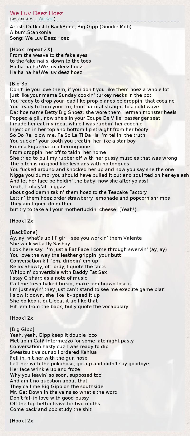 Artist: Outkast f/ BackBone, Big Gipp (Goodie Mob) Album:Stankonia Song: We Luv Deez Hoez [Hook: repeat 2X] From the weave to the fake eyes to the fake nails, down to the toes Ha ha ha ha!We luv deez hoez Ha ha ha ha!We luv deez hoez [Big Boi] Don't lie you love them, if you don't you like them hoez a whole lot Just like your mama Sunday cookin' turkey necks in the pot You ready to drop your load like prop planes be droppin' that cocaine You ready to turn your fro, from natural straight to a cold wave Dat hoe name Betty Big Shoez, she wore them Herman monster heels Popped a pill, now she's in your Coupe De Ville, passenger seat I made her eat my meat while I was rubbin' her coochie Injection in her top and bottom lip straight from her booty So Do Re, blow me, Fa So La Ti Da Ha I'm tellin' the truth You suckin' your tooth you treatin' her like a star boy From a Figueroa to a herringbone From droppin' her off to takin' her home She tried to pull my rubber off with her pussy muscles that was wrong The bitch is no good like lesbians with no tongues You fucked around and knocked her up and now you say she the one Nigga you dumb, you should have pulled it out and squirted on her eyelash And let her face be holdin' the baby, now she after yo ass! Yeah, I told y'all niggaz about god damn takin' them hoez to the Teacake Factory Lettin' them hoez order strawberry lemonade and popcorn shrimps They ain't goin' do nuthin' but try to take all your motherfuckin' cheese! (Yeah!) [Hook] 2x [BackBone] Ay, ay, what's up lil' girl I see you workin' them Valente She walk wit a fly Sashay Look here say, I'm just a Fat Face I come through swervin' (ay, ay) You love the way the leather grippin' your butt Conversation kill 'em, drippin' em up Relax Shawty, oh lordy, I quote the facts Whippin' convertible with Daddy Fat Sax I stay G sharp as a note of music Call me fresh baked bread, make 'em brawd lose it I'm just sayin' they just can't stand to see me execute game plan I slow it down, she like it - speed it up She polked it out, beat it up like that Hit 'em from the back, bully quote the vocabulary [Hook] 2x [Big Gipp] Yeah, yeah, Gipp keep it double loco Met up in Cafй Intermezzo for some late night pasty Conversation hasty cuz I was ready to dip Sweatsuit velour so I ordered Kahlua Fell in, hit her with the gun hose Left her with the pokahose, got up and didn't say goodbye Her face wrinkle up and froze Why you leavin' so soon, supposed too And ain't no question about that They call me Big Gipp on the southside Mr. Get Down in the vains so what's the word Don't fall in love with good pussy Off the top better leave for two moths Come back and pop study the shit [Hook] 2x