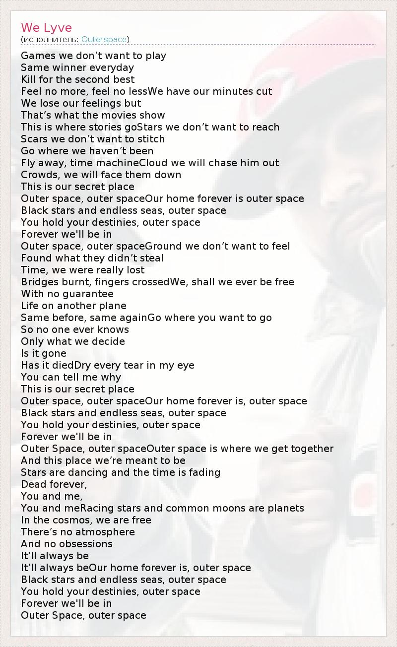 Games we don’t want to play Same winner everyday Kill for the second best Feel no more, feel no lessWe have our minutes cut We lose our feelings but That’s what the movies show This is where stories goStars we don’t want to reach Scars we don’t want to stitch Go where we haven’t been Fly away, time machineCloud we will chase him out Crowds, we will face them down This is our secret place Outer space, outer spaceOur home forever is outer space Black stars and endless seas, outer space You hold your destinies, outer space Forever we'll be in Outer space, outer spaceGround we don’t want to feel Found what they didn’t steal Time, we were really lost Bridges burnt, fingers crossedWe, shall we ever be free With no guarantee Life on another plane Same before, same againGo where you want to go So no one ever knows Only what we decide Is it gone Has it diedDry every tear in my eye You can tell me why This is our secret place Outer space, outer spaceOur home forever is, outer space Black stars and endless seas, outer space You hold your destinies, outer space Forever we'll be in Outer Space, outer spaceOuter space is where we get together And this place we’re meant to be Stars are dancing and the time is fading Dead forever, You and me, You and meRacing stars and common moons are planets In the cosmos, we are free There’s no atmosphere And no obsessions It’ll always be It’ll always beOur home forever is, outer space Black stars and endless seas, outer space You hold your destinies, outer space Forever we'll be in Outer Space, outer space